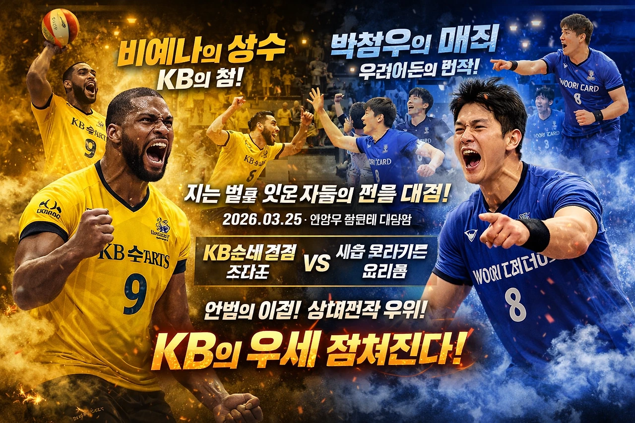 "물러설 곳 없는 외나무다리 위, 승리는 오직 가장 간절하면서도 ‘영리한’ 자의 몫이다. 정규리그 최종전에서 기적의 3위를 탈환하며 안방으로 우리카드를 불러들인 KB손해보험. 그리고 '박철우 매직'을 앞세워 6위에서 4위까지 기적의 반등을 일궈낸 우리카드. 오늘 의정부 경민체육관은 ‘진검승부’라는 이름 아래, 좌우 날개와 중앙 속공이 쉴 새 없이 교차하는 고도의 수 싸움을 예고하고 있다."