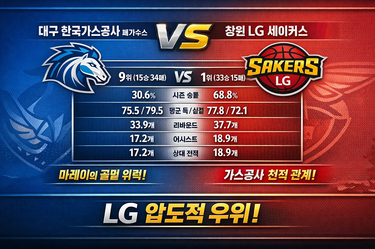 "숫자는 거짓말을 하지 않지만, 농구 코트 위에는 숫자보다 무서운 ‘상성’이 존재한다. 리그 9위에 머물러 있지만 유독 LG만 만나면 발톱을 드러내는 한국가스공사. 그리고 3연승과 함께 정규리그 우승을 정조준하는 창원 LG. 오늘 대구 실내체육관은 38.2%라는 승률 격차를 지워버리는, 올 시즌 가장 끈적한 승부의 전장이 될 것이다."