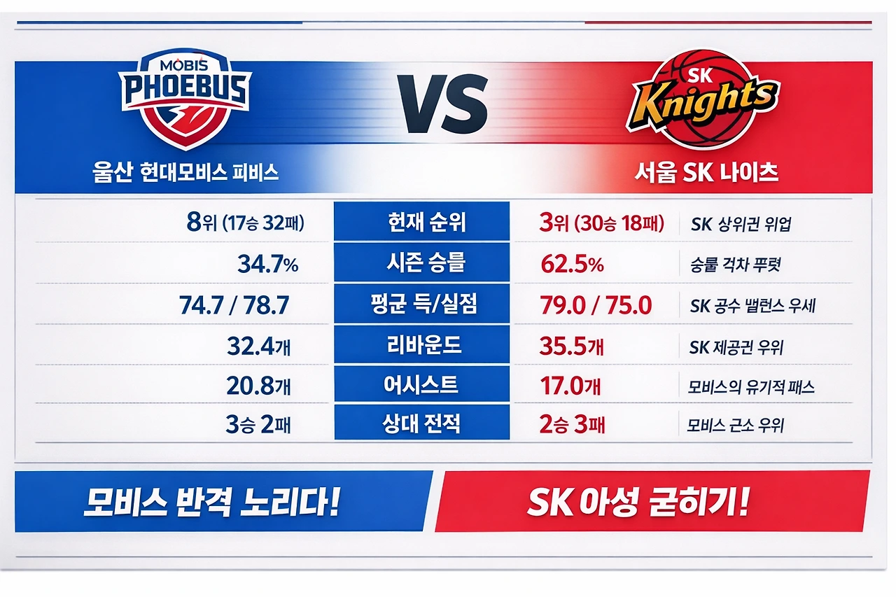 현대모비스는 8위를 굳건히 지키며 연패를 끊어야 하고, SK는 지난 패배를 딛고 2위 자리를 탈환하기 위한 추격 불씨를 지펴야 합니다.