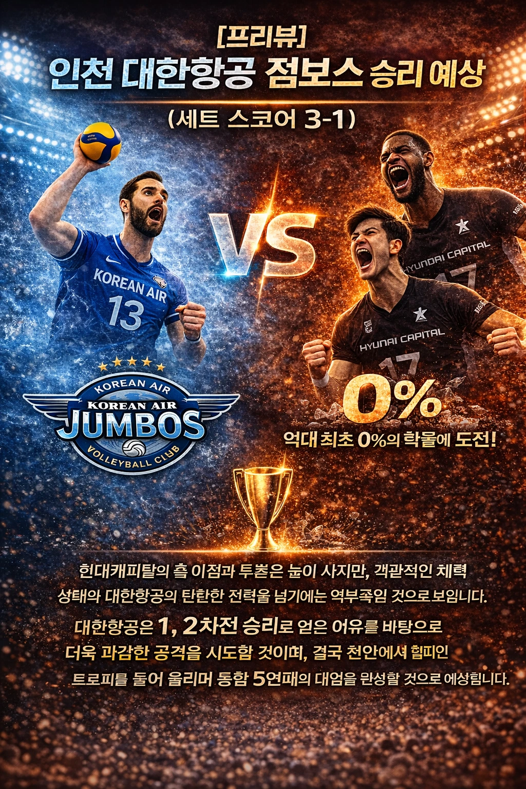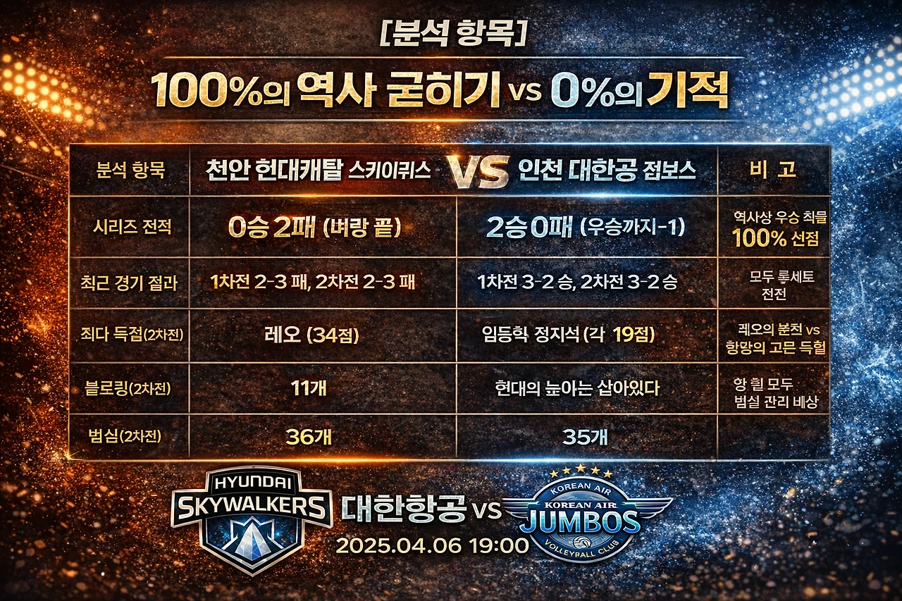 ​"배구의 역사는 '1, 2차전 승리 팀의 우승 확률 100%'라고 말한다. 하지만 천안 유관순 체육관의 뜨거운 함성은 그 숫자를 비웃을 준비가 되어 있다. 통합 5연패를 눈앞에 둔 대한항공의 관록이냐, 벼랑 끝에서 '역대급 업셋'의 서막을 열려는 현대캐피탈의 투혼이냐. 오늘 19시, 챔피언 결정전의 종지부가 찍힐지 아니면 새로운 드라마가 시작될지가 결정된다."