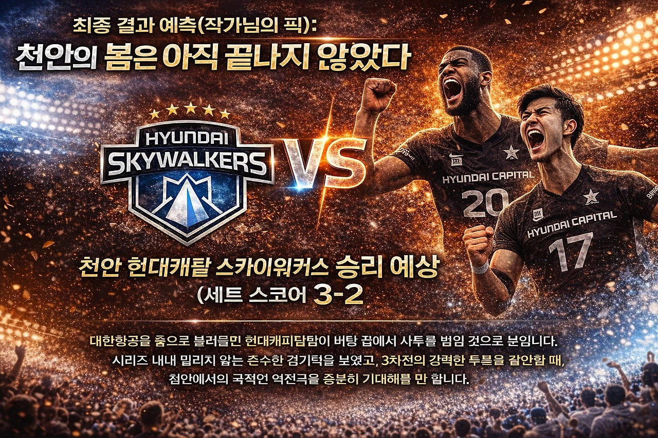 ​"배구 역사상 '1, 2차전 패배 팀의 역전 우승 확률 0%'라는 차가운 통계를 천안의 뜨거운 함성이 녹이기 시작했다. 3차전에서 '분노의 기폭제'를 터뜨리며 기사회생한 현대캐피탈, 그리고 예상치 못한 셧아웃 패배에 전열을 가다듬은 대한항공. 오늘 19시, 챔피언 결정전의 향방을 가를 운명의 4차전이 천안에서 다시 불을 뿜는다."