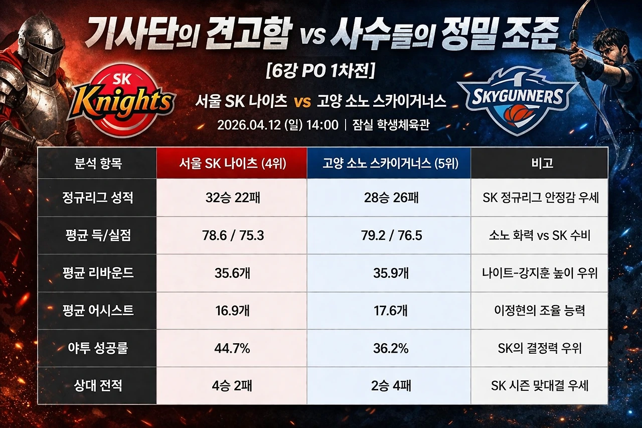 "정규리그의 모든 기록은 리셋되었다. 이제는 단기전의 몰입도가 승부를 가른다. 플레이오프 1차전 승리 팀의 4강 진출 확률은 약 90%. 오재현과 김낙현이 이끄는 서울 SK의 새로운 시스템 농구와, ‘루키 빅맨’ 강지훈이 버티는 고양 소노의 기세가 잠실에서 충돌한다. 오늘 14시, 4강을 향한 가장 중요한 첫 번째 퍼즐이 맞춰진다."