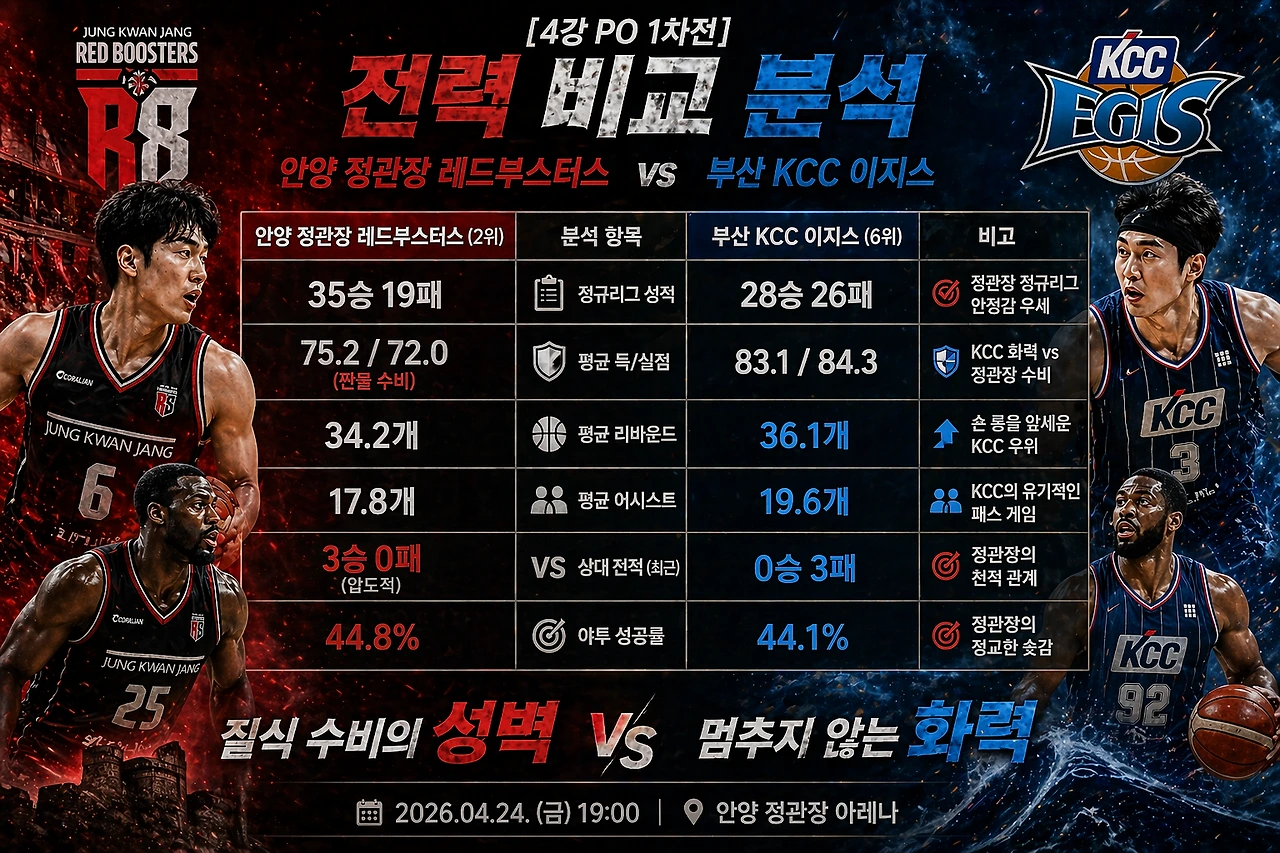 "기록은 안양 정관장의 수비(실점 72.0점)가 얼마나 견고한지 말해주고 있지만, 최근 기세는 부산 KCC의 화력(득점 83.1점)이 얼마나 뜨거운지 증명하고 있다. 정규리그 2위의 ‘관록’이냐, 또 한 번의 업셋을 꿈꾸는 ‘슈퍼팀’의 진격이냐. 오늘 19시, 조니 오브라이언트의 높이와 숀 롱의 파괴력이 정면으로 충돌한다."
