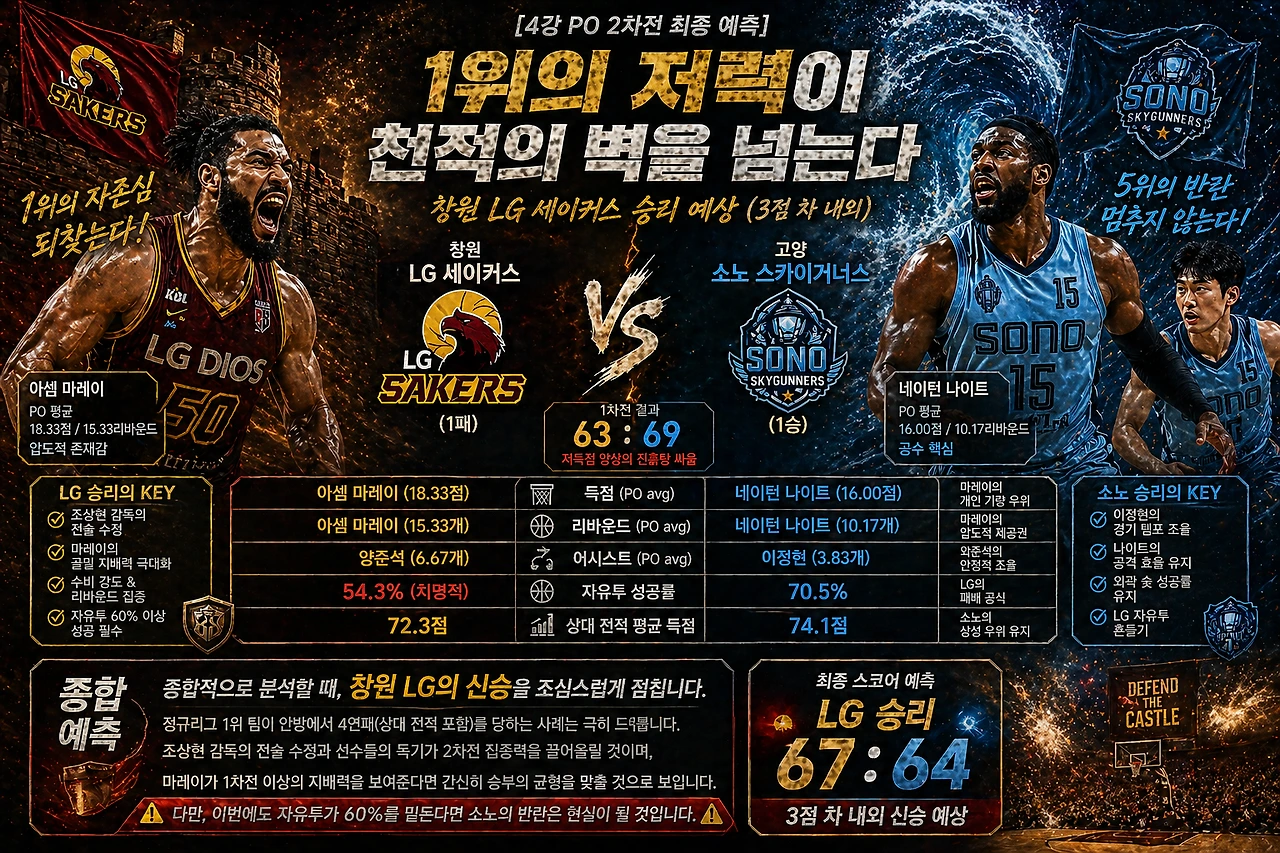 "데이터는 창원 LG의 우위를 말해왔지만, 실전은 고양 소노의 '천적 관계(최근 3연승)'를 증명하고 있다. 안방에서 1패를 안고 시작하는 1위의 중압감과, 4강 진출 확률 70% 이상을 선점하려는 5위의 패기. 오늘 오후 창원은 마레이의 골밑 수성이냐, 소노의 시스템 폭격이냐에 따라 시리즈의 향방이 결정될 것이다."
