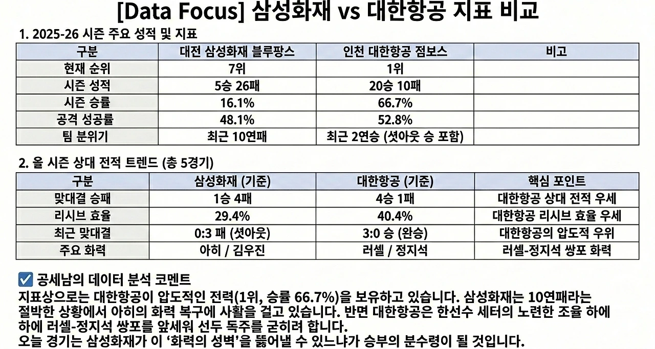 "가장 낮은 곳에서 절규하는 블루팡스와, 가장 높은 곳에서 내려다보는 점보스가 만난다. 아히의 창이 대한항공의 견고한 성벽을 뚫을 수 있을 것인가, 아니면 한선수의 지휘 아래 '항포터'의 위엄이 대전벌을 뒤덮을 것인가."