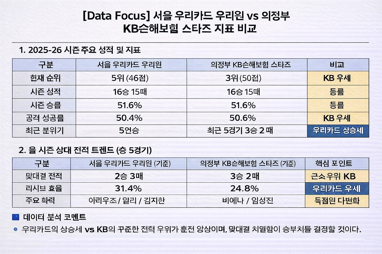 "파죽의 6연승으로 봄배구를 향해 돌진하는 우리카드와, 매서운 화력으로 3위 자리를 굳건히 지키려는 KB손해보험이 만난다. 아라우조-알리-김지한으로 이어지는 삼각편대가 KB의 블로킹 벽을 무너뜨릴 것인가, 아니면 비예나-임성진 '쌍포'가 장충벌을 맹폭할 것인가."