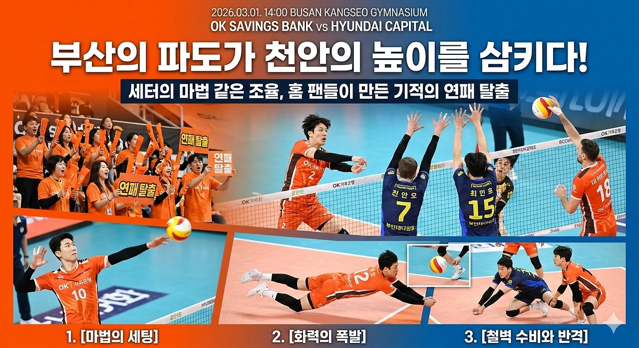 3연패 수렁에서 벗어나 5위 도약을 꿈꾸는 부산 OK저축은행과, 2연패를 끊고 선두 탈환의 불씨를 살리려는 천안 현대캐피탈의 만남