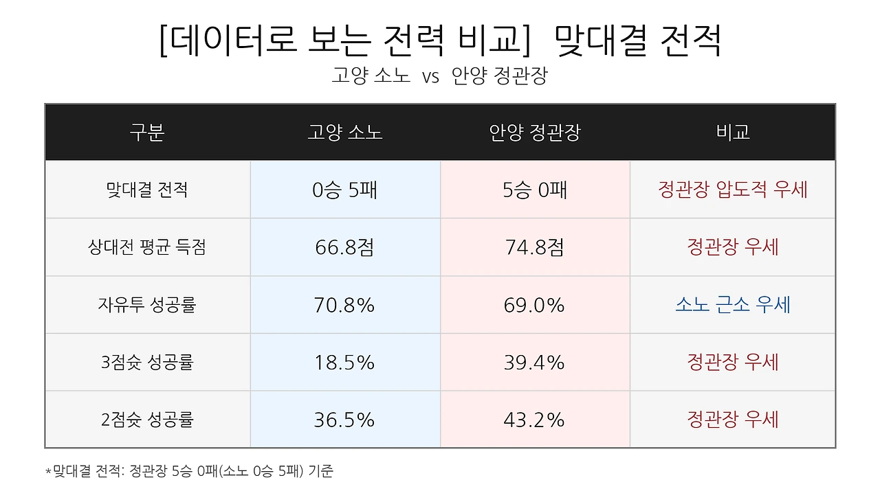 천적 징크스 타파: 올 시즌 정관장전 5전 전패. 하지만 켐바오와 나이트가 합류한 지금의 소노는 이전과는 다른 팀입니다. 4쿼터 집중력 저하만 극복한다면 첫 승도 머지않았습니다.