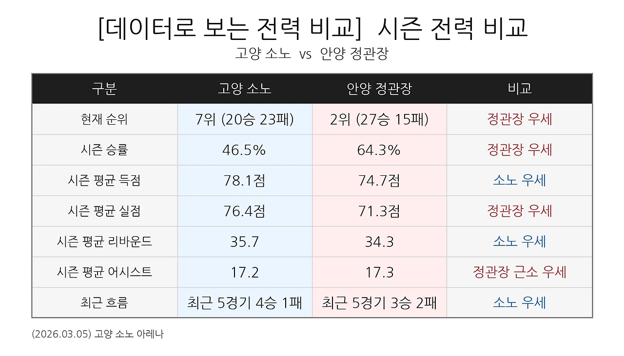 "국가대표 브레이크라는 짧은 쉼표가 찍혔다. 이제 남은 것은 플레이오프를 향한 처절한 마침표뿐이다. 6강행 막차를 타기 위해 화력을 집중하는 소노와, 가장 견고한 방패로 왕좌의 뒷자리를 지키는 정관장. 고양 소노아레나의 림은 오늘 누구의 손을 들어줄 것인가."
