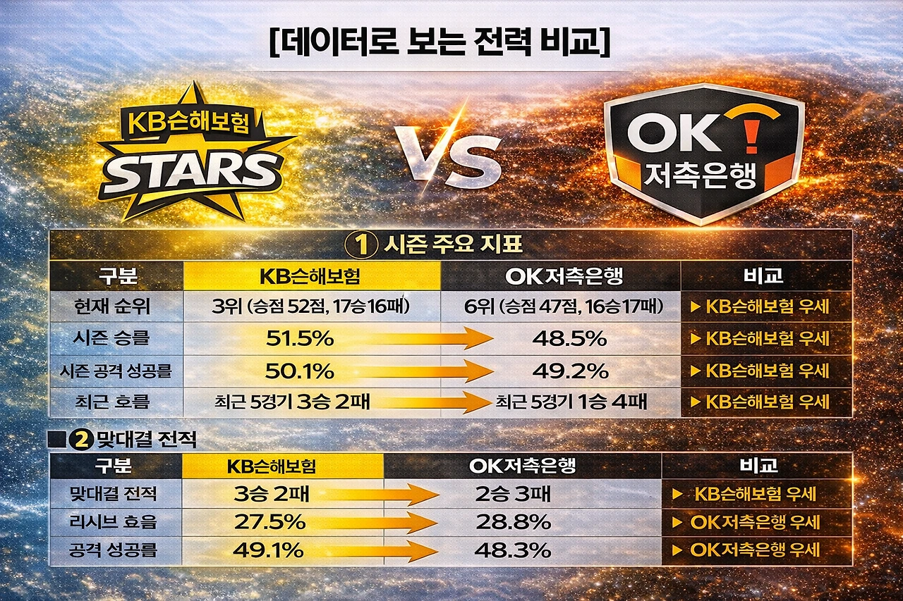 "안방에서 뼈아픈 셧아웃 패배를 당하며 자존심을 구긴 KB손해보험이 다시 한번 3위 탈환을 노린다. 이에 맞서는 OK저축은행은 직전 경기 기적 같은 리버스 스윕 승리의 기운을 이어가며 '봄배구'라는 불가능해 보이는 미션에 도전한다. 비예나의 강력한 스파이크가 의정부 하늘을 가를 것인가, 아니면 전광인과 차지환의 끈질긴 디그가 기적을 완성할 것인가."