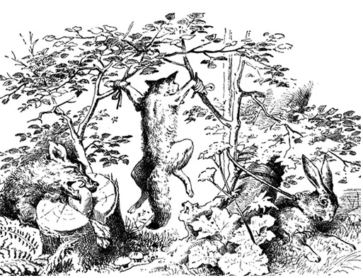 두 번째로 나타난 동물은 여우이다. 늑대만큼의 육체적 힘을 가지고 있지 않기에 계략과 술책을 가진 교활한 여우는 나무 사이로 살금살금 다가왔다. 역시 여우도 그가 원하는 동물이 아니다. 조심스럽게 다가오는 누군가는 나도 모르게 어떤 문제에 휘말리게 할 사람이다. 여우는 키 큰 나무들 사이에 서 있는 구부린 개암나무로 여우를 왼쪽 앞발을 묶고 다른 쪽에는 오른쪽 앞발을 묶어 여우를 공중에 떠 있게 했다. 개암나무의 장력은 현의 장력과도 비슷하다. 매듭을 팽팽하게 묶인 것과 같으니까. 늑대와 똑같이 말하고 갈 길로 갔다.