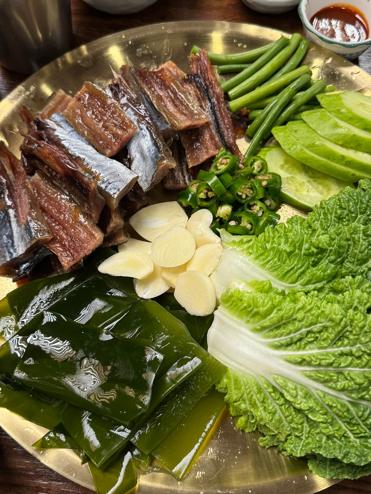 입가에 기름기가 남아 느끼함이 올라올 즈음, 과메기가 자리를 잡았다. 큼직한 과메기는 가족의 시선을 단번에 붙잡았다. 야들야들한 청빛을 품은 과메기와 쌈배추, 편으로 썬 마늘, 동그란 청양고추, 사각다시마, 마늘쫑, 편으로썬 오이, 김. 조금 전 먹던 보쌈을 싹 잊게 할 만큼 신선하면서도 비릿한 겨울의 맛이 테이블 위에 펼쳐졌다. 과메기는 그렇게 우리의 마음까지 사로잡았다.