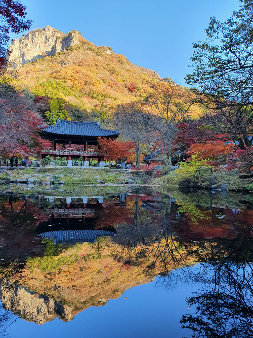 붉은 단풍이 사람을 매혹한다. 서늘한 바람이 불어오면 사람들의 발걸음도 빨라진다. 백양사 입구의 쌍계루 단풍은 가치 절경이다. 쌍계루의 반영은 거울보다 선명하다. 바람 한 점 없는 가을 풍경이 만들어놓은 절경이다. 지나가는 이의 발걸음을 붙잡는다.
