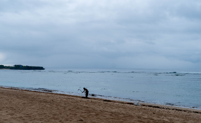 밤이 지나고 아침이 되었다. 가볍게 아침에 카메라를 둘러메고 산책을 했다. 어젯밤 비바람이 불어 해변가로 해조류가 몰려와 더러웠는데 혼자 바닷가를 청소하는 사람이 보였다. 호텔 직원일 것이다. 아니면 지역주민에게 주는 일거리 일수도 있다. 투숙객을 깨끗하게 맞이하기 위하여 해변가를 아침에 청소하는 모습이다. 인도네시아 발리의 아름다운 풍경이다.