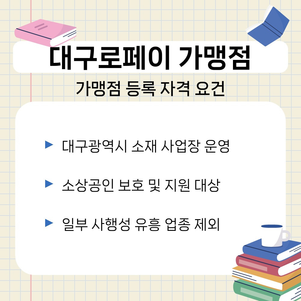 대구로페이 가맹점으로 등록하기 위해서는 먼저 대구광역시 내에 사업장을 두고 있어야 합니다. 기본적으로 소상공인 보호 및 지원에 관한 법률에 따른 소상공인 분들이 주된 대상이 됩니다. 지역 경제 활성화를 목적으로 하기에 대구에 사업자 등록이 되어 있어야 신청이 가능해요. 다만 모든 업종이 가능한 것은 아니며 일부 사행성 업종이나 유흥업소 등은 등록 대상에서 제외될 수 있습니다. 본인의 사업장이 등록 가능한 업종인지 미리 살펴보시는 것이 좋습니다.
