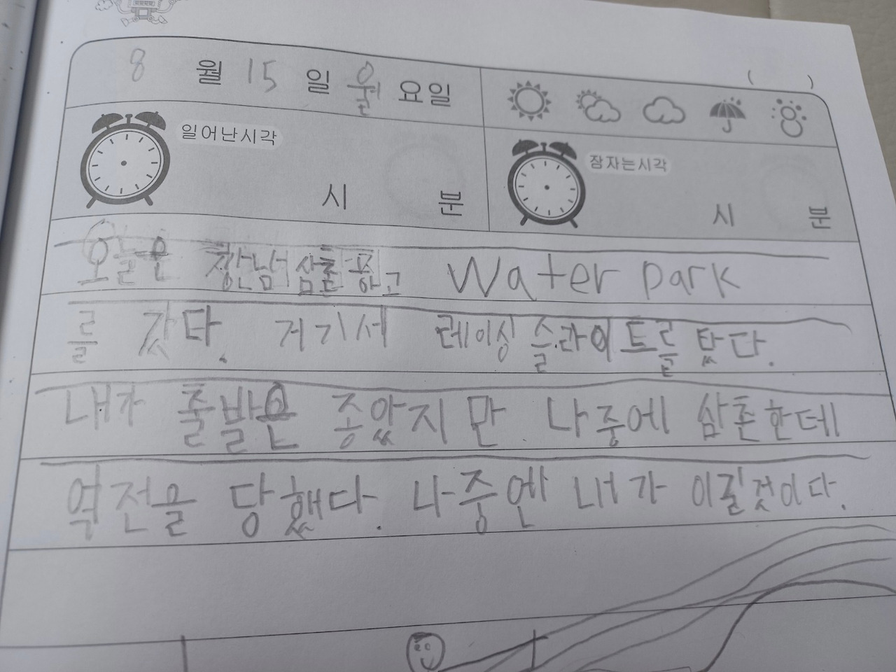 워터파크에서 귀가해서 저녁 늦게 나의 조카, 즉 나의 사촌동생의 초등학생 어린이의 일기장이 카톡 공동 방에 오픈이 되었다. '오늘은 강남 삼촌하고 water park를 갔다. 거기서 레이싱 슬라이드를 탔다. 내가 출발은 좋았지만 나중에 삼촌한테 역전을 당했다. 나중에 내가 이길 것이다.(8/15 대윤이 일기장)' 초등학생의 일기장 글쓰기 수준이 생각보다 높았다. 본인의 감정을 솔직하게 쓴다는 것은 쉬운 일이 아니다. 거기다가 영어까지 섞어서 쓰다니 말이다. 나의 초등학교 2학년 때를 비교해 보면 대단한 아이이다. 난 그 아이가 잘 되었으면 좋겠다. 아니, 그 아이는 분명히 잘 될 것이다. 왜냐하면 그 아이는 어릴 때 모유를 1년 동안이나 먹었다는 얘기를 들었기 때문이다. 요즘은 모든 아이들이 '소젖'을 먹고 자라는데 '모유'를 먹었다는 것은 대단한 일이기 때문이다.