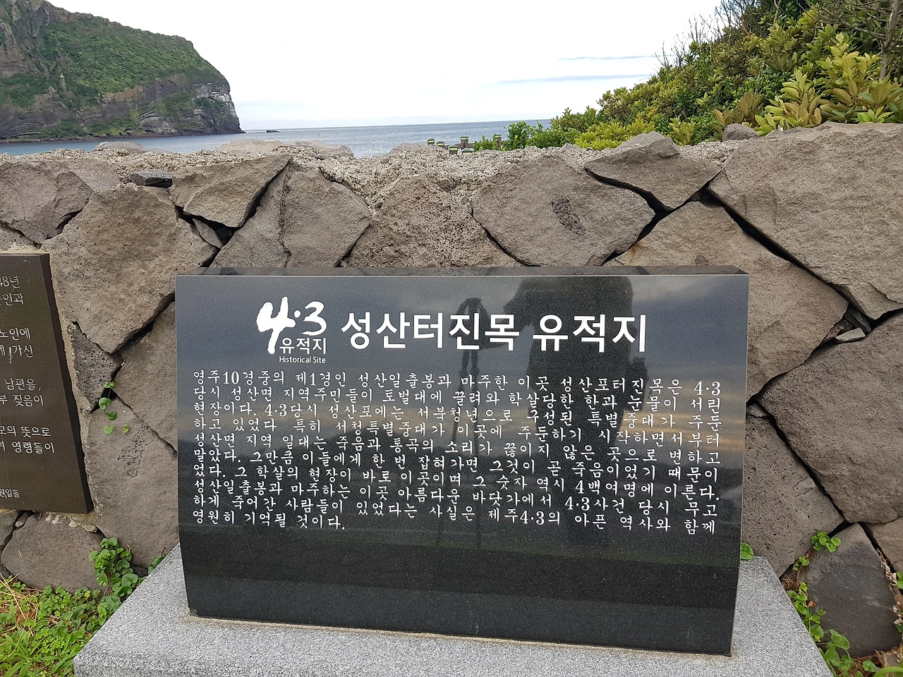 성산일출봉은 제주도에서도 가장 인기 있는 곳이다. 제주도 신혼여행에서 많은 이들이 행복한 감정을 갖고 성산일출동을 찾는다. 하지만 외지인들이 잘 모르는 슬픈 역사가 있는 곳이 바로 성산일출봉이다. 하나는 태평양 전쟁 말기(1945년경)에 일본군에 의해 만들어진 18개의 '동굴진지(제주 전체 104개)'이고 또 하나는 '4.3 성신터진목 유적지(1948년)' 가 그것이다. 여행을 시작하기 전에 4.3 사건을 배경으로 하는 <지슬, 끝나지 않는 세월2 (오멸 감독, 2013년작)>이라는 영화를 유튜브를 통해서 찾아봤다. 제주도를 수십 번을 다녀갔지만 나는 제주의 슬픈 역사에 대해 관심이 없었다. 아마도 제주도을 찾는 대부분의 관광객이 같은 생각일 것이다. 하지만 오늘의 올레길은 나에게 '천천히 살라'고 이야기해주고 슬픈 과거의 역사도 말해주고 있다.