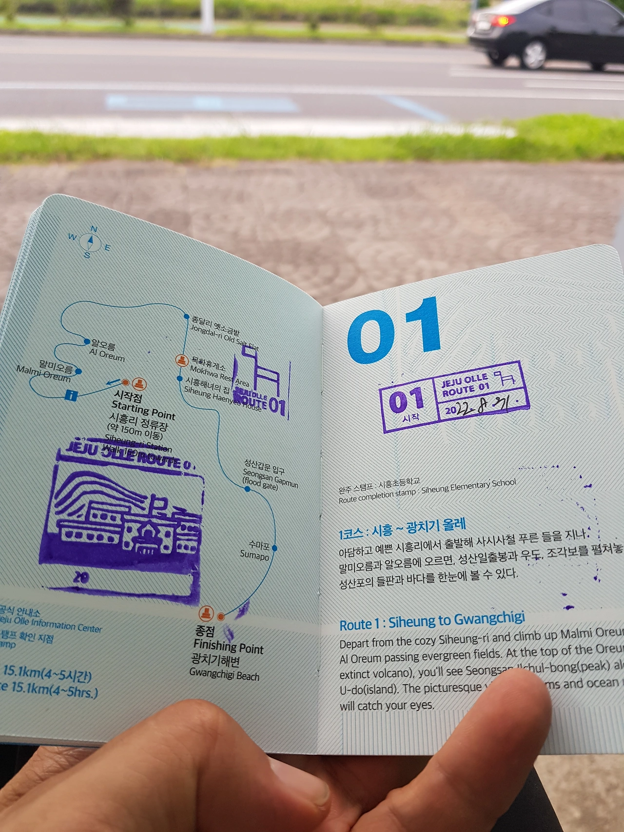 박베낭을 맡기고 가벼운 차림으로 숙소근처 '종달리'에서 버스를 타고 제1코스 시작점인 '시흥리'에서 내렸다. 제주시에 속하는 '종달리'는 21코스의 마지막 코스이고 1코스 시작점인 '시흥리'는 서귀포시에 속한다. 우연인지 아님은 일부러 그랬는지 올레코스는 섬의 동쪽 끝자락 서귀포시의 '시흥리'의 '시'로 시작해서 시계방향으로 한 바퀴를 돌고 제주시의 '종달리'의 '종'으로 끝난다. 올레 제1코스 내에서도 시흥리, 종달리, 시흥리로 다시 이어진다. 초입의 올레 안내소에서 '올레 패스포트'를 구입하고 제주도 368 개의 오름 중에 하나인 '말미오름'을 올랐다. 숨이 차오르고 땀이 흥건해지기 시작했다. 정상에 오르자 바닷바람이 온몸의 열기를 식히고 눈앞에는 성산 일출봉과 우도가 푸른 바다 위에 우뚝 솓아 올라 장관을 이루었다.