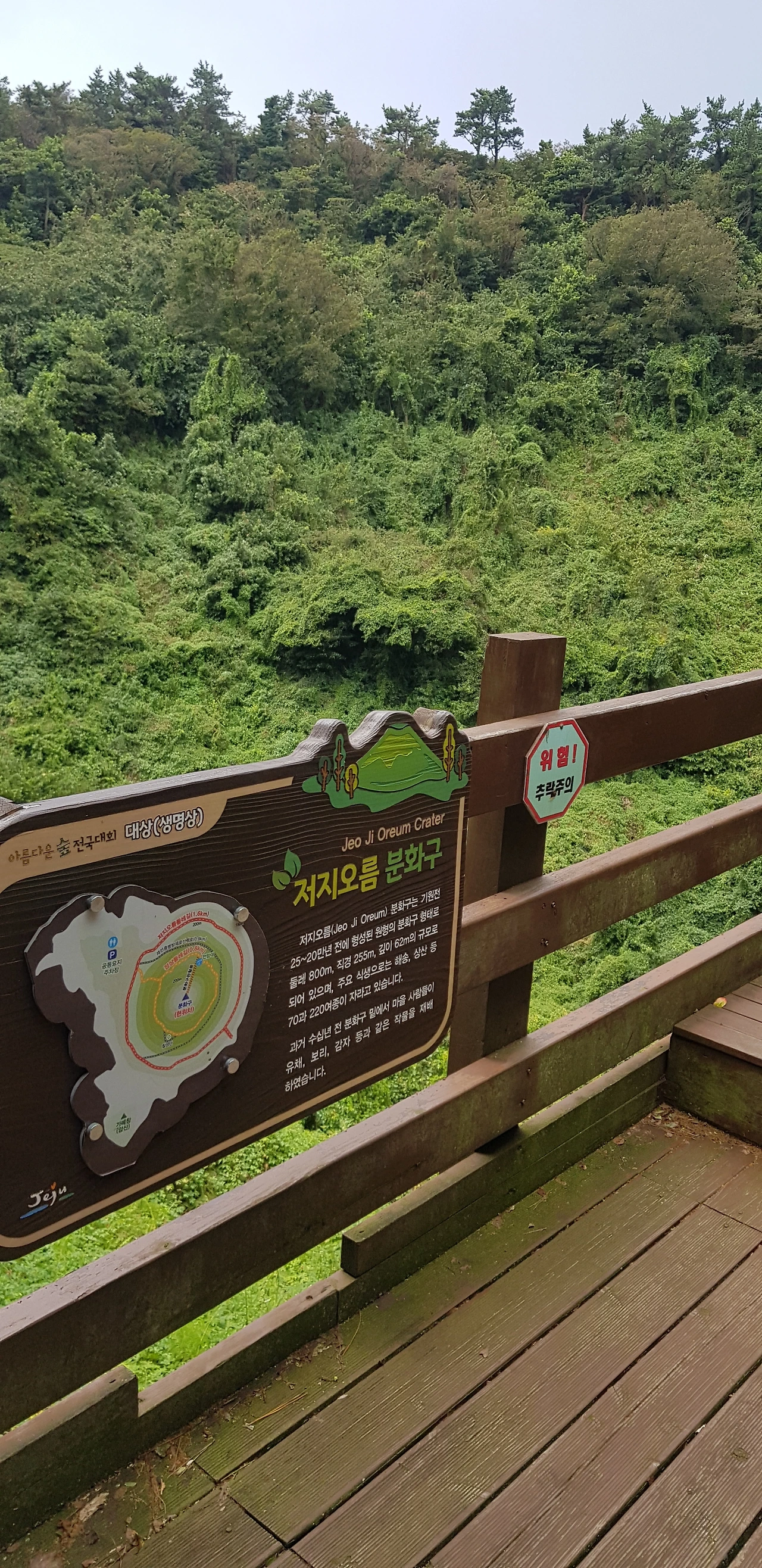 낙천리 의자마을을 지나 13코스의 하이라이트인 '저지오름(높이 390m)'에 올랐다. 오름 정상에 깊이가 60m인 원형 분화구를 볼 수 있을 것이라는 희망감으로 정상에 오르고 또 분화구 밑으로 내려갔다. 한라산의 백록담 같은 느낌을 기대했지만 물은 없고 온갖 수풀림으로 뒤덮여 있어서 낯설기는 했지만 나름 특별한 경험이었다. '저지'라는 것은 '닥나무(예전에 '한지'를 만드는 재료로 사용)'의 한자식 표현이라고 한다. 예전에 이곳에 닥나무들이 많아서 '닥마르오름' 이라고도 불렸다. 이 동네의 마을 이름도 '저지 마을'이다. 이 마을이 올레꾼에게는 특별하다. 왜냐하면 3개 코스(13코스, 14코스, 14-1코스)가 이곳에서 만나기 때문이다. 올레 전 코스에서 이렇게 3개 코스가 만나는 곳은 이곳이 유일하다.