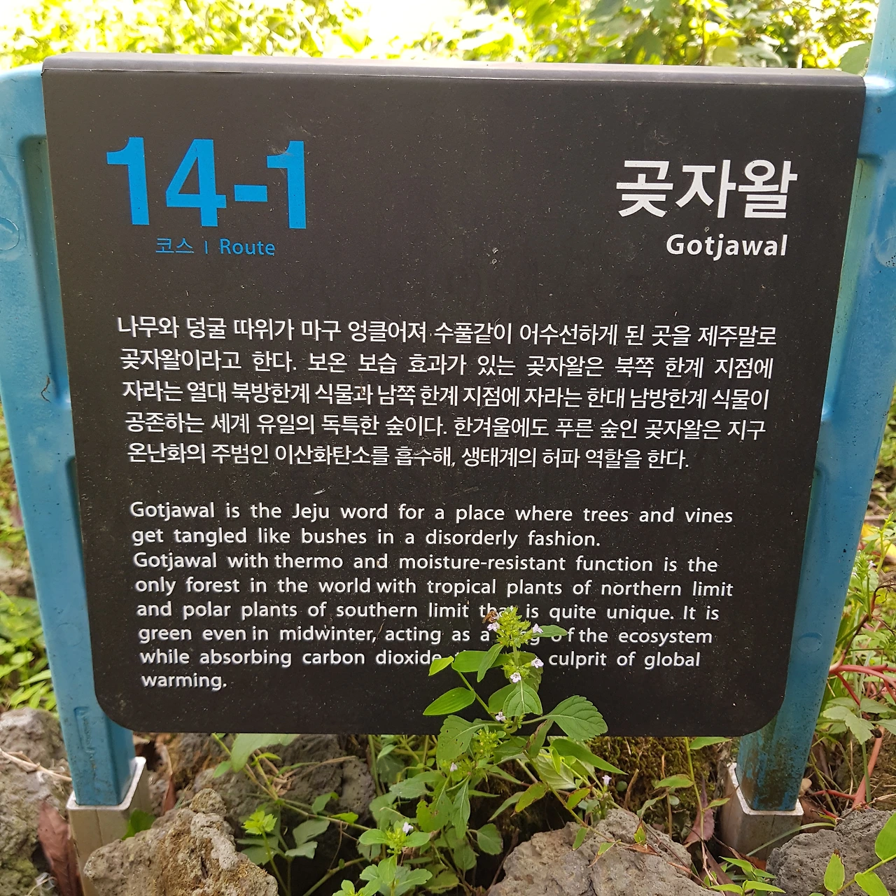 '곶자왈'이라는 말은, '깊은 숲'을 뜻하는 '곶' 과 '마구 엉클어진 덤불'을 뜻하는 '자왈'의 제주 합성어이다. 제주 중간산지역(한라산과 해안지대의 중간지역)에 형성된 원시림을 일컫는 말이다. 제주도에 있는 곶자왈 지역은 제주 전체면적의 6% 정도이지만 사람 몸의 허파처럼 섬의 생명유지 기능을 맡고 있다. 수치상으로는 크게 차지하지는 않지만 곶자왈을 포함한 전체 녹색지대는 체감상으로는 제주도 전체 면적의 90% 수준이 넘는 것처럼 느껴진다. 곶자왈이라고 명명된 올레코스는 총 4군데이다. 며칠 전에 다녀온 11코스(모슬포~무릉마을)와 오늘 진행한 14-1코스(저지마을~오설록 녹차밭), 그리고 15-A코스(한림항~고내포구), 19코스(조천 만세동산~김녕 해변)이다.