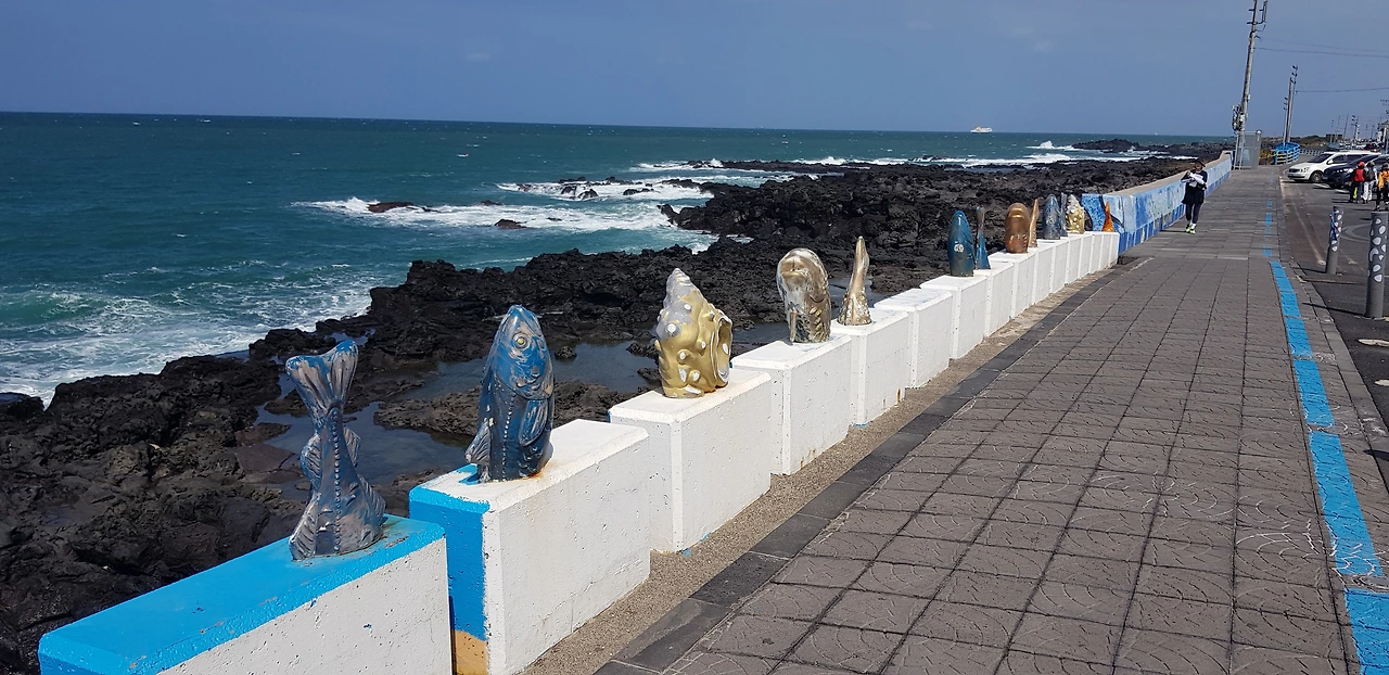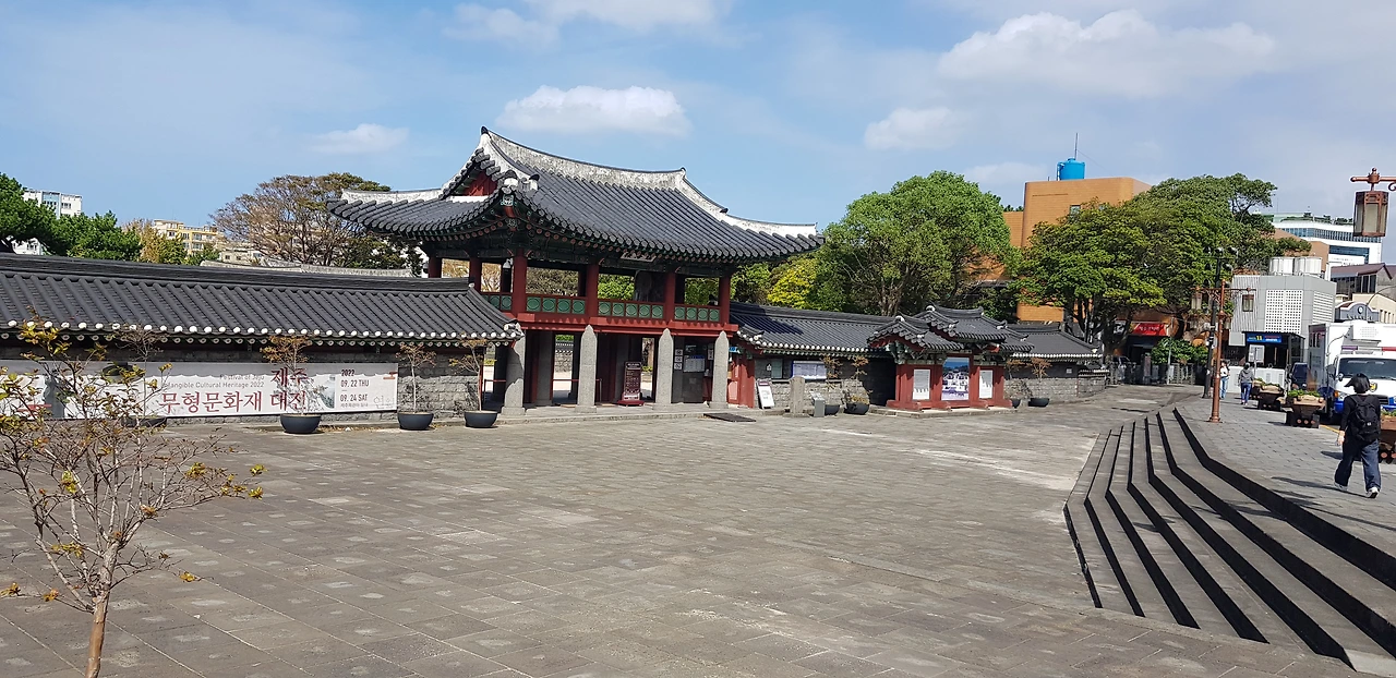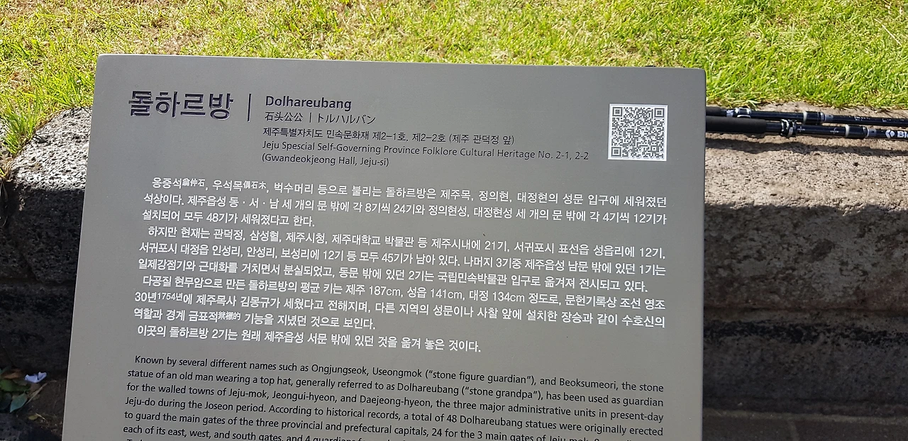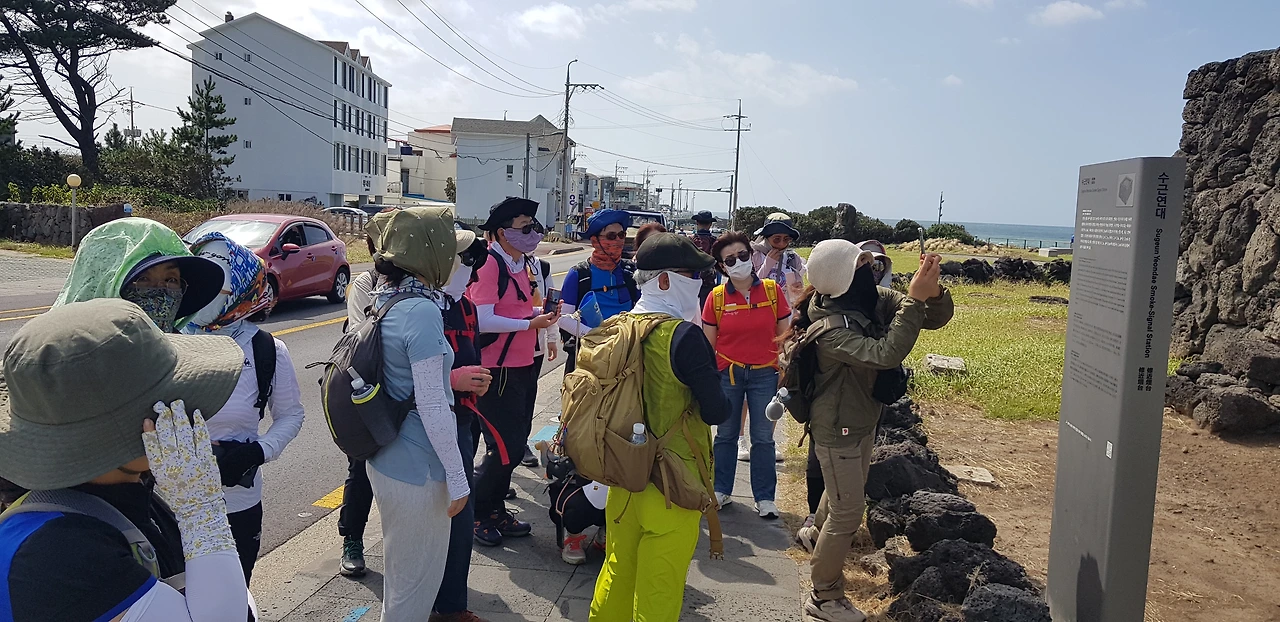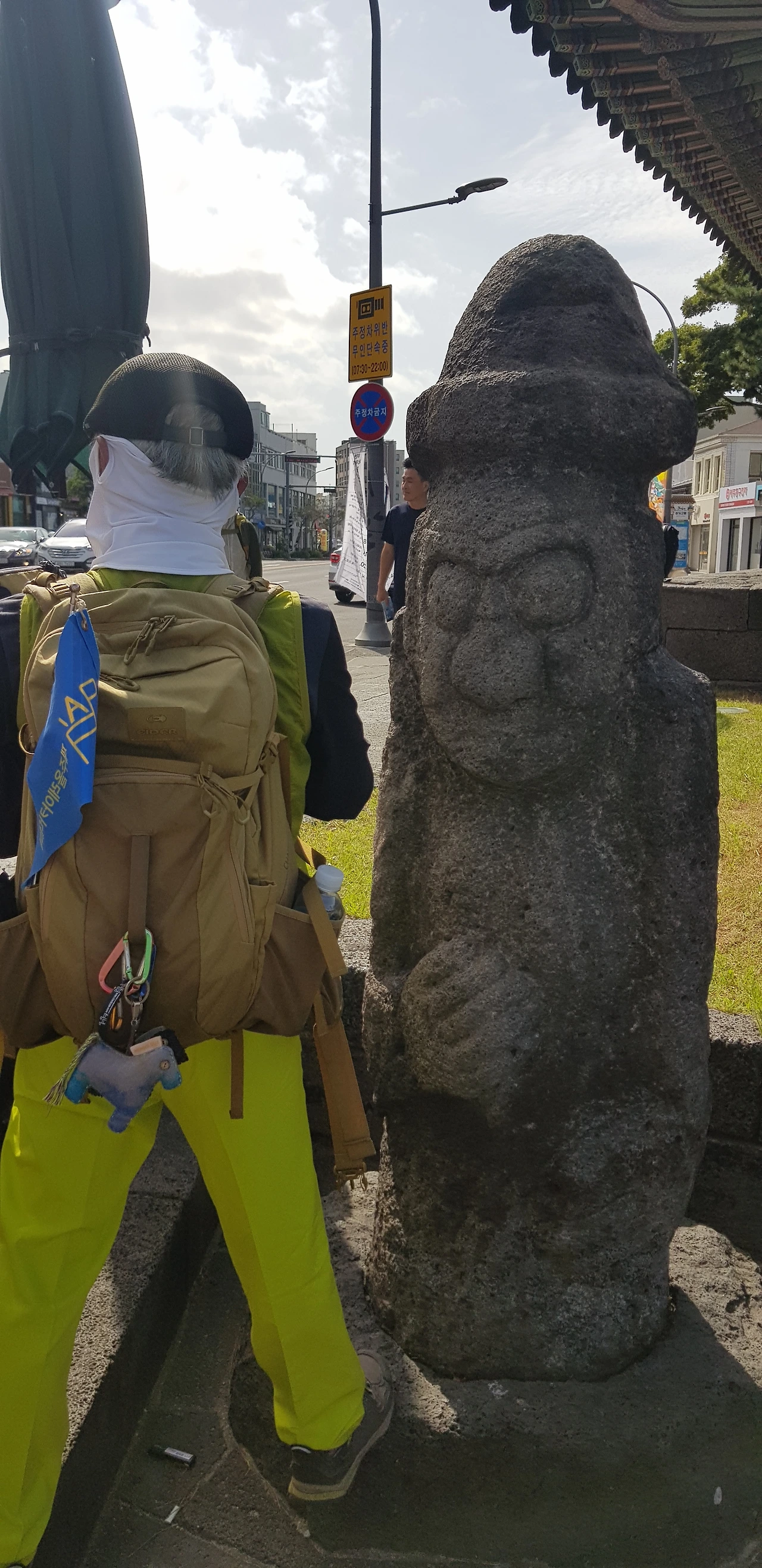 물론 혼자 다닐 때 비해 불편한 것도 있다. 마을마다 유례나 장소 설명을 하는 게시판이 설치되어 있지만 단체로 이동을 하다 보니 충분한 시간 확보가 안돼서 그냥 넘어가는 경우가 자주 발생한다. 그리고 가끔 카페에 들러 멋진 바다 풍광을 보면서 우아하게 '카푸치노'를 마시거나 편의점에 들러 '쭈쭈바'를 먹고 싶을 때가 있는데, 함께 하다 보니 그게 안된다. 그럼에도 불구하고 많은 여성 참가자는 '아카자봉'을 선호한다. 왜냐하면 '안전' 측면에서 함께 하는 것이 최대의 장점이기 때문이다. 오늘 여성 참가자들이 월등히 많은 것도 그런 이유에서 인듯하다. 함께 걷다 보니 벌써 종점인 과거 제주 행정의 중심지이자 4.3 사건의 시발점이 되었던 '관덕정'에 도착해서 돌하루방의 이야기를 들으며 올레 17코스를 마무리했다.