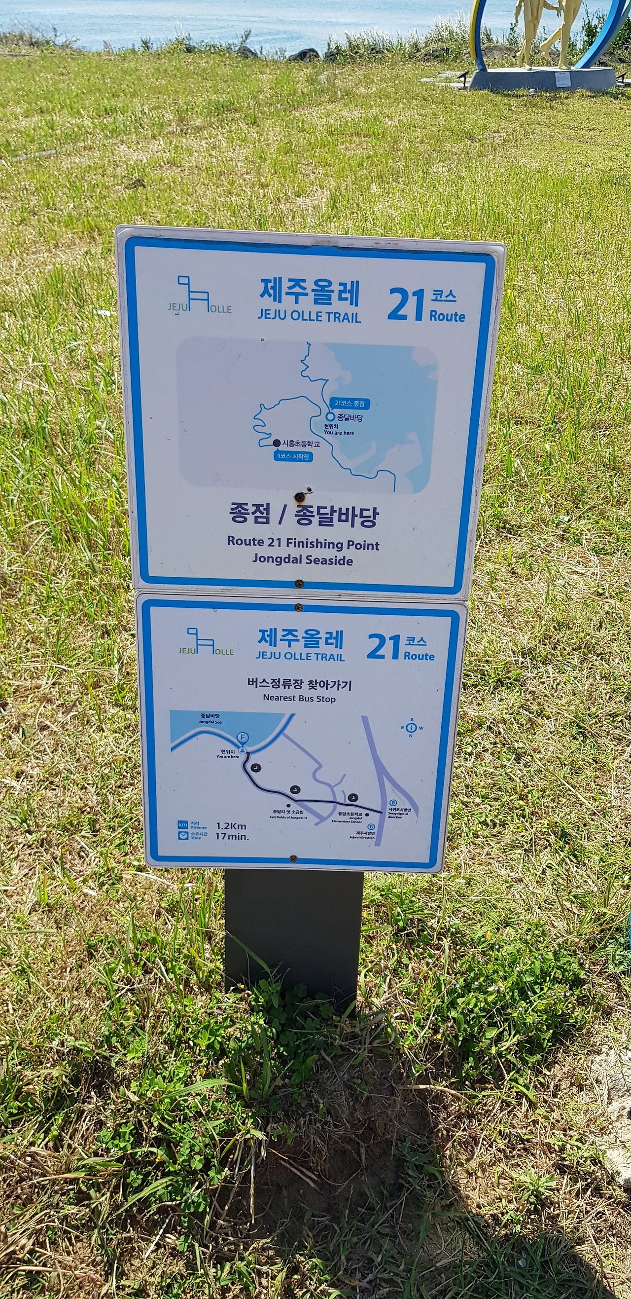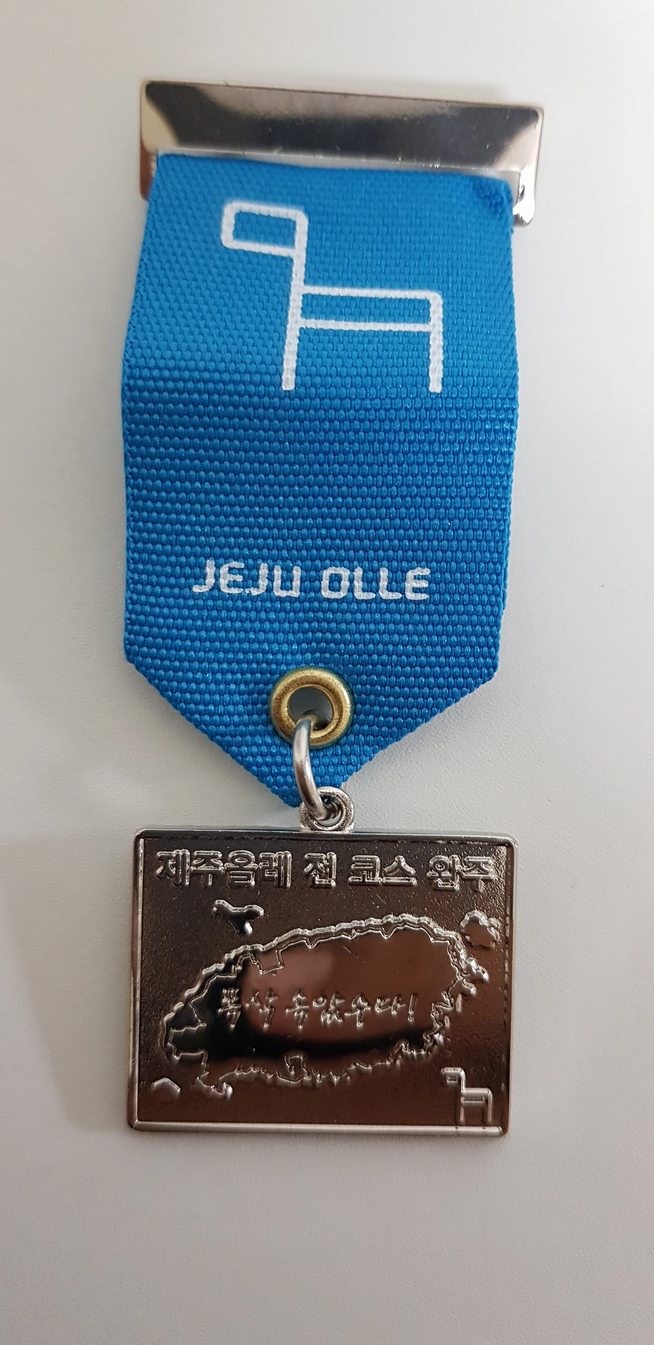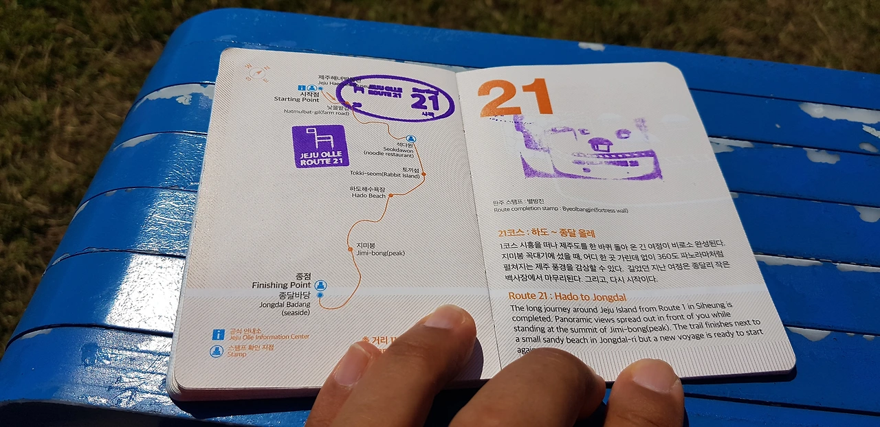 코스 후반부에 있는 지미봉은 올레길 첫 번째 베이스캠프였던 게스트 하우스 바로 옆에 있던 오름이다. 오름에서 보니 내가 첫번째로 묵었던 게스트 하우스가 보인다. 한 달 전에 제주도에서 첫날을 보낸 설렘이 아직도 생생한데 벌써 한 달이 지났다. 이제는 제주도에 대한 설렘보다는 편안하다는 마음이 먼저 든다. '한달살이'에 내가 제주도 사람이 된 것도 아닌데 말이다. 종달항을 지나 종점 스탬프가 있는 종달 바당에 거의 다 가서 올레 19코스의 그녀를 드디어 다시 만났다. 나의 완주를 축하할 겸 함께 갓 말린 반건조 오징어에 시원한 캔 맥주 한잔을 하고 다시 헤어졌다. 올레길에서는 그렇게 만났다가 헤어졌다가를 반복한다. 종달리에서 버스를 타고 서귀포 올레센터로 이동해서 센타 1층 홀에서 주위사람들의 박수와 함께 완주증과 메달을 받았다. 뿌듯한 느낌과 감정이 북받쳐 오른다. 이렇게 나의 '제주 한 달 살면서 올레길 걷기'는 마무리가 되었다.