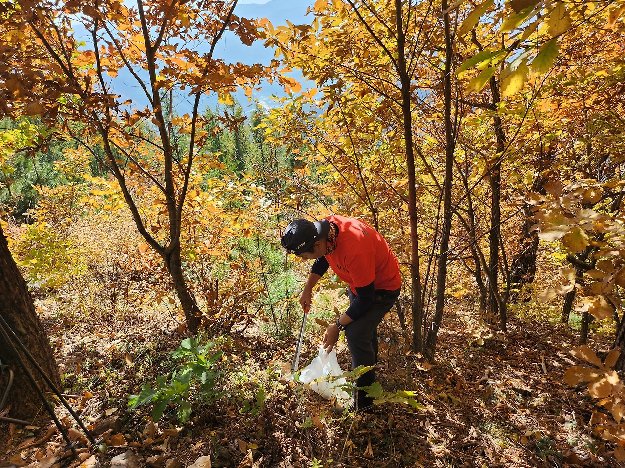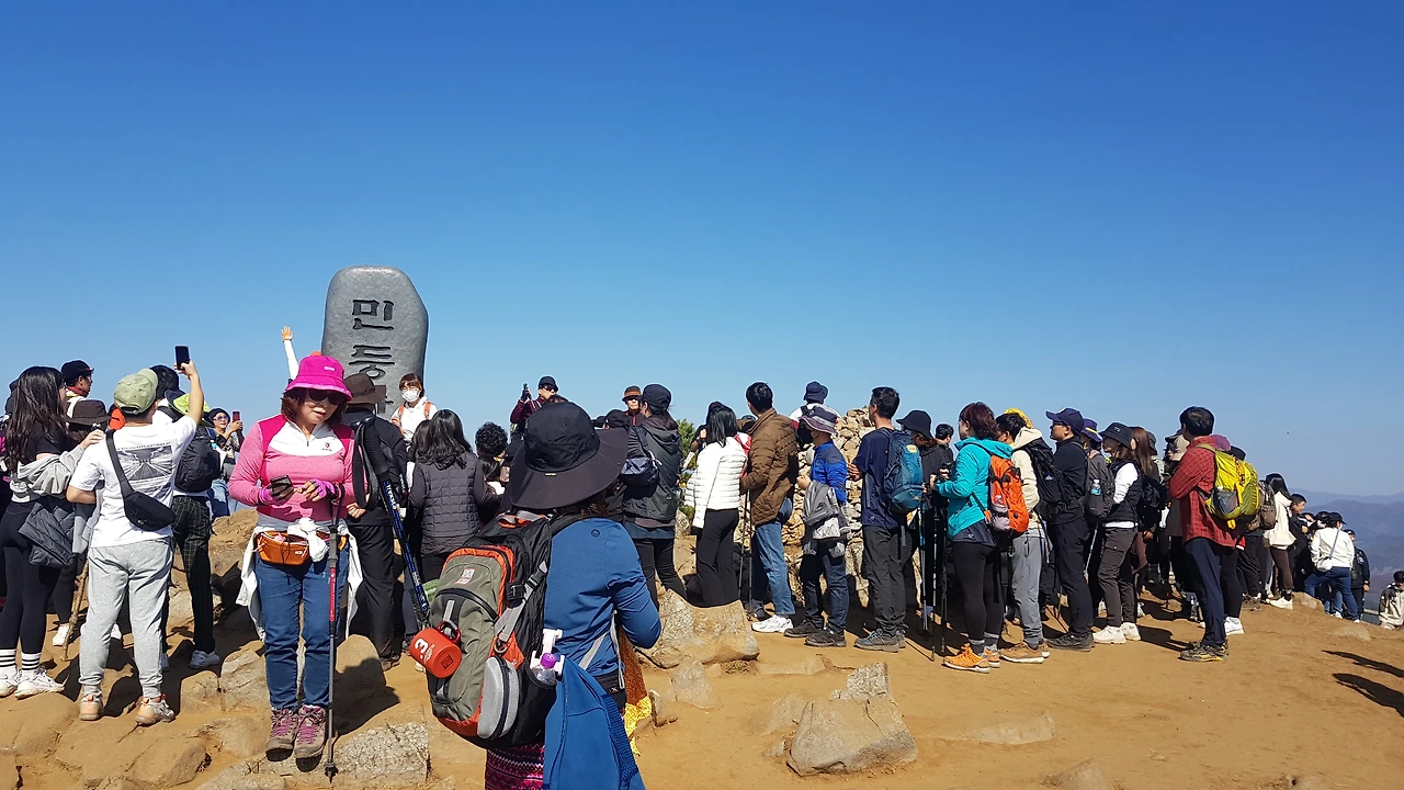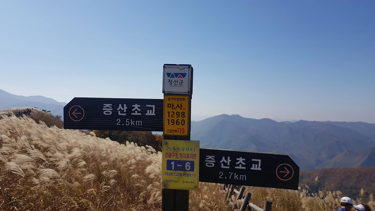 오백 미터를 걸어 급경사(90분 소요)와 완경사(100분 소요)의 갈림길에서 왼쪽 완경사를 선택했다. 하지만 말이 상대적으로 완경사이지 계속되는 경사에 땀은 이마에서 얼굴을 타고 땅바닥에 널브러져 있는 낙엽으로 연신 떨어진다. 그러던 와중에도 역시 강원도의 깊은 산속 공기은 거친 호흡을 통해 찌든 나의 폐를 계속해서 정화시켜 나를 건강하게 해준다. 정상에 가까워지자 나타나는 바람에 흩날리는 억세풀 무리의 흰 회백 향연은 지친 육신에 엔돌핀을 폄프질 한다. 정상에 오르니 주위에 억새풀의 군락이 멀리 강원도의 깊은 산들을 뒤로하고 바람에 날려 춤을 추고 있다. 자연은 나를 감동시켜주고 있지만 정상석 부근에 인증사진을 찍으려는 사람들은 뱀처럼 늘어뜨린 기다란 줄이 조금은 안쓰러운 마음이 든다. 일행은 정상석이 살짝 보인 곳에서 단체사진을 찍고 정상데크에서 준비한 점심을 먹고 서둘러 하산후 귀경길에 오른다.