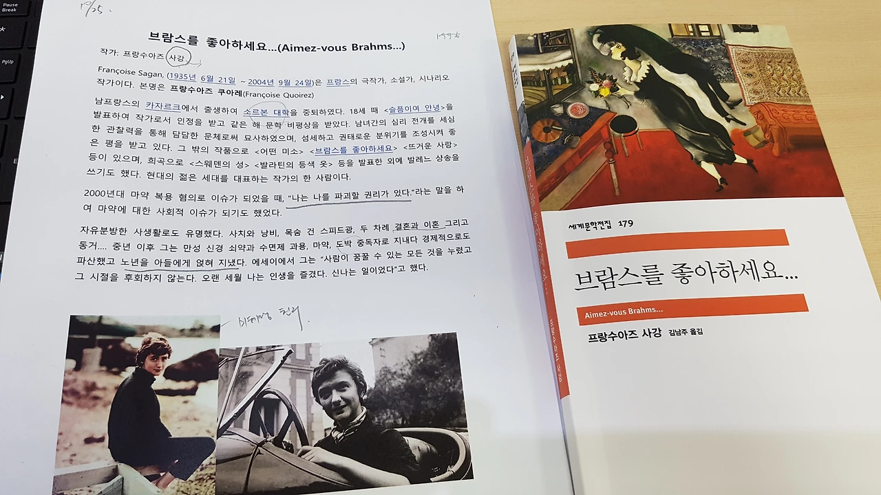 격주 화요일 아침에 두 시간씩 도서관 세미나실에서 진행되는 첫 번째 독서토론에 '프랑수아즈 사강' 작가의 <브람스를 좋아하세요…,2008년, 민음사>라는 책을 읽고 설레는 마음으로 참석했다. 신입회원이다 보니 사전에 발제문을 받아보지 못해서 조금은 답답했지만 시작 전에 나눠준 인쇄물에 있는 5개 정도의 발제문을 얼른 흩어보았다. 총 8명(신입회원 3명 포함)이 토론형 배열의 자리에 앉아서 리더님의 클럽에 대한 소개와 더불어 각자 자기 소개를 하고 발제문을 하나씩 읽어 나갔다. 6년이나 되는 독서클럽이라서 그런지 왠지 안정된 분위기가 느껴지고 편안하고 부드러운 분위기에서 서로의 생각을 자유롭게 나누었다. 역시나 같은 글을 읽고도 느끼는 감정이나 생각들이 상이하다는 것을 다시 한번 느꼈다.