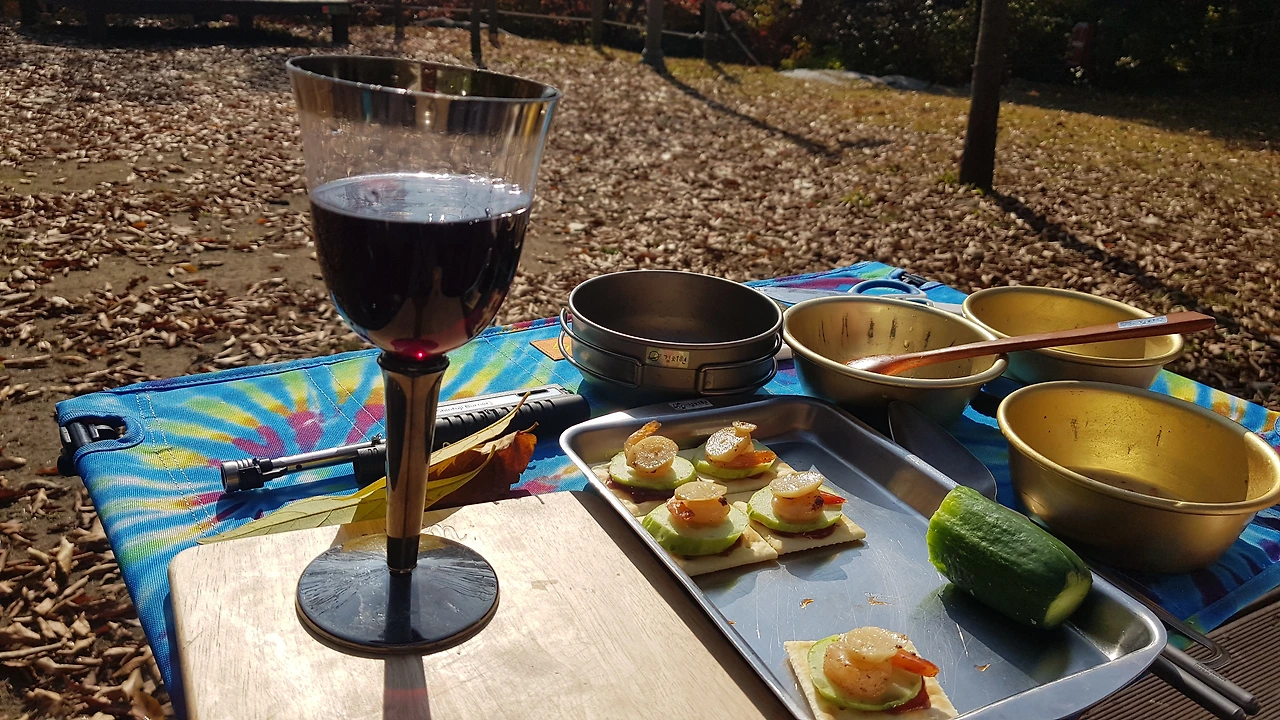 이곳에 오면 도시의 소리가 완전히 차단된다. 산에서 불러오는 바람소리, 그 바람에 나뭇잎이 서로 부딪히는 소리, 계곡물이 흐르는 소리 그리고 여러 종류의 새소리가 들린다. 특히 새벽녘에는 그 소리들이 더 선명하게 들린다. 눈앞에 보이는 색은 온통 푸른 초록색에 가을에는 그 색이 알록달록 다양해진다. 산 위에서 불을 피우는 것은 불법이지만 이곳 야영장에서는 가능하다. 캠핑요리를 위해서 ‘화기’ 사용이 가능하다는 뜻이다. 야영장 주차장에서 나무데크 까지 20kg의 박 배낭을 메고 한참 동안 경사길을 오르면 숨이 헉헉거리고 등줄기에 땀이 흘러내린다. 숨을 고르고 배낭을 데크 위에 세운다. 그리고 배낭 옆에 끼워져 가져온 ‘힐리녹스’ 의자와 테이블을 조립한다.