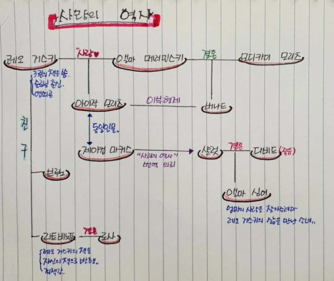 소설 초반에 너무 이해가 안가서 인터넷을 통해 입수간 '인물 관계도' 이다. 마치 암호를 풀어주는 '해독문' 처럼 이야기를 이해하는데 도움을 주었다. 작성해주신 블로거 '햇살' 님께 감사를 드립니다. 책을 처음 읽다가 이해가 안되시는 분들만 참고하세요.