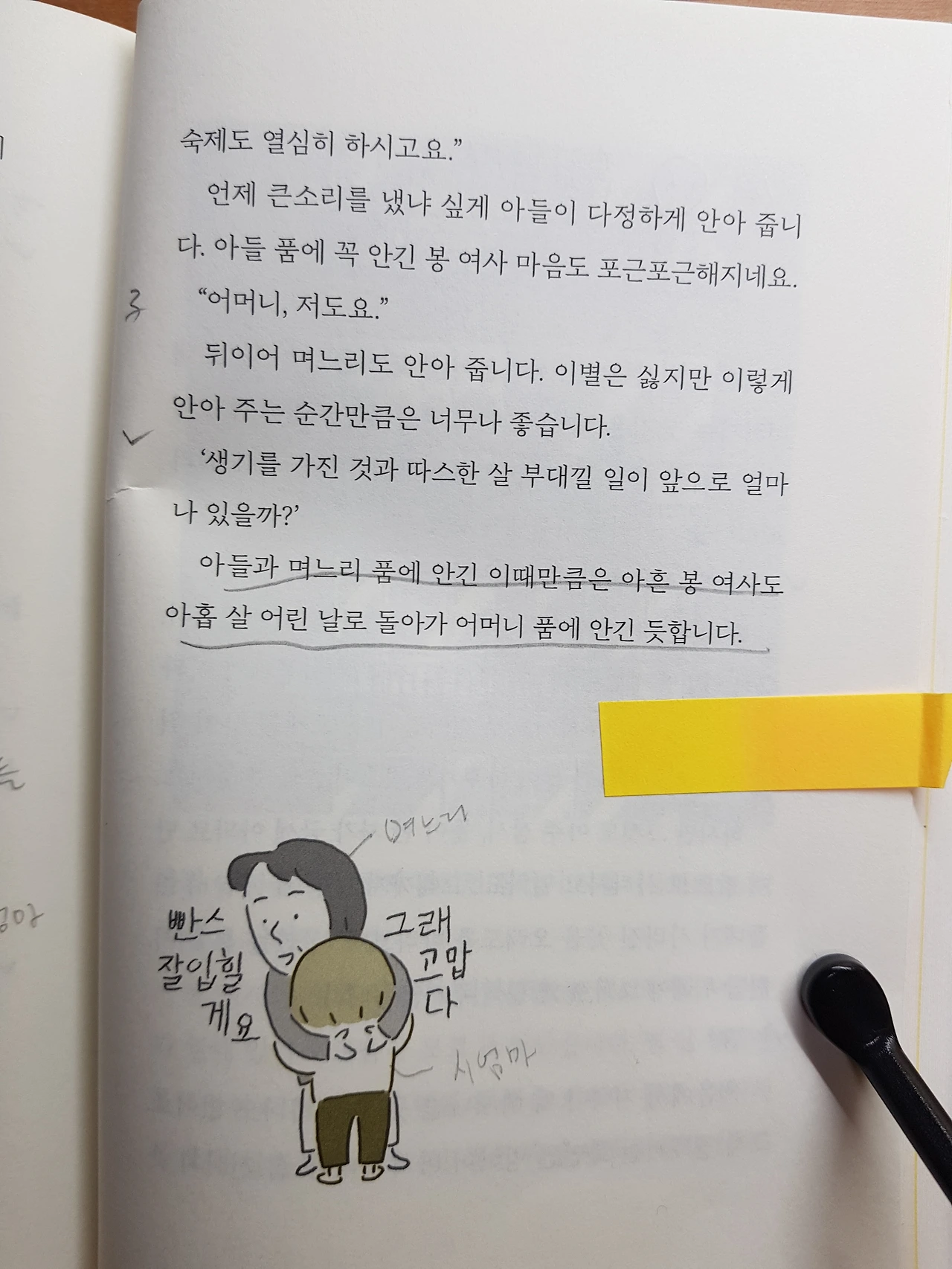 "생기를 가진 것과 따스한 살 부대낄 일이 얼마나 있을까?" 아들과 며느리 품에 안긴 이때만큼은 아흔 봉 여사도 아홉 살 어린 날로 돌아가 어머니 품에 안긴 듯합니다. (p227)