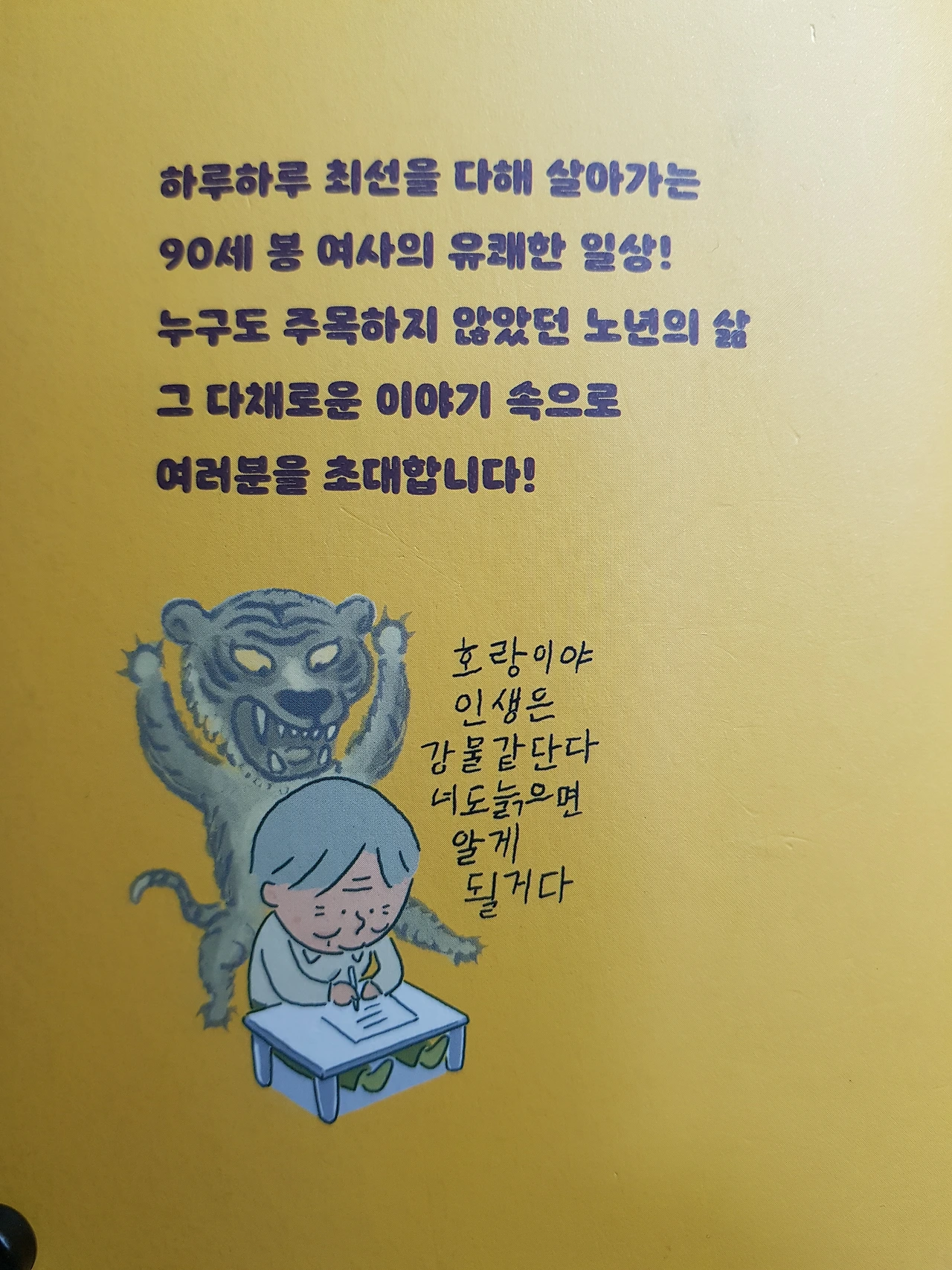 제주도에서 태어나고 자란 김유정 작가의 두 번째 책으로 2021년, 경남 통영에 있는 남해의 봄날이라는 출판사를 통해 출간되었다. 그녀는 그림책 만들기 프로젝트에 시어머니와 참여하면서 시어머니의 이야기를 온전히 듣고 아흔 살이 넘어서도 일상을 충실하게 살아가는 시어머니의 삶을 지켜보면서 노년의 풍경을 고스란히 전하고 싶어서 이 책을 썼다. 저자의 첫 번째 책으로는 본인의 일상을 풀어쓴 <제주에서 크는 아이, 2015, 장천>가 있다.