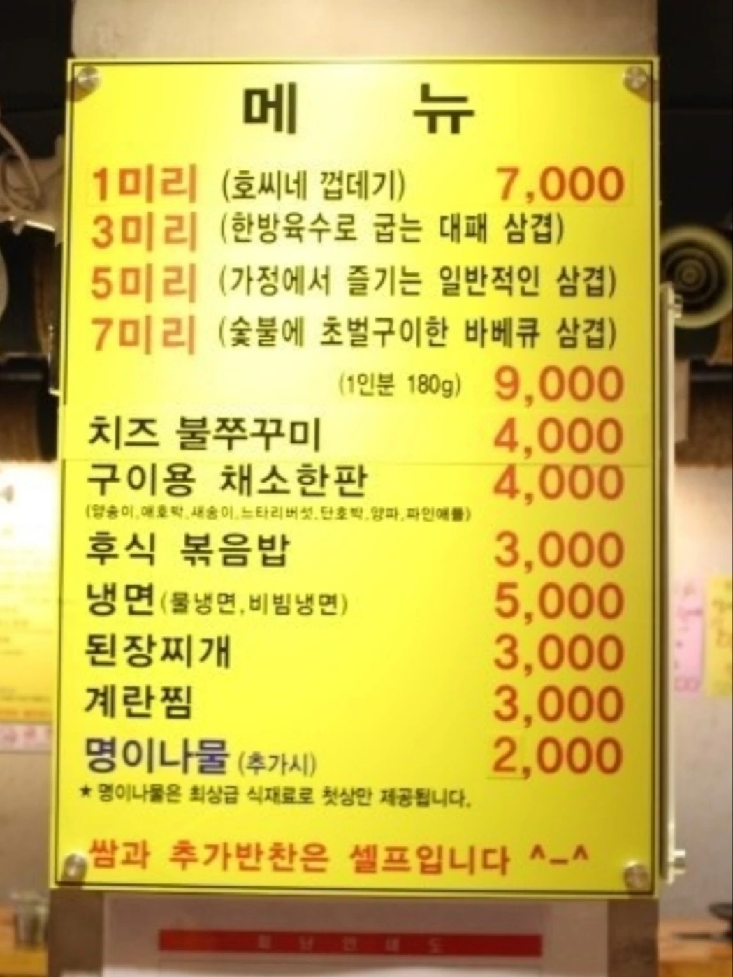 저녁 약속시간보다 조금 일찍 장소에 도착했다. 굳은 마음을 먹고 지하에 있는 식당 계단을 내려가는데, 벌써부터 삼겹살 굽는 냄새가 스멀스멀 후각을 자극하고 온 몸의 세포를 흔들어 깨운다. 자리를 잡고 앉아서 미리 온 회원들과 이런저런 얘기를 하면서 빠르게 메뉴를 스캔했다. '치즈 불주꾸미', '계란찜'이 눈에 들어왔다. 다행히 쌈에 김치만 싸 먹는 것은 면할 수 있을 거 같아서 회심의 미소를 지었다. 오늘의 주인공인 생일자까지 오고 나서 메인 메뉴인 '5mm짜리 옛날 삼겹살 7인분'과 '치즈 불주꾸미'를 사이드 메뉴로 주문했다. 지글지글 윤기 자르르 흐르는 김치와 함께 익는 삼겹살이 여전히 나를 유혹하고 있었지만 이상하게도 젓가락이 가지는 않았다. 판이 여러 번 바뀌고 고기의 종류도 '3mm짜리 한방 육수 대패삼겹살'로 바뀌었다.