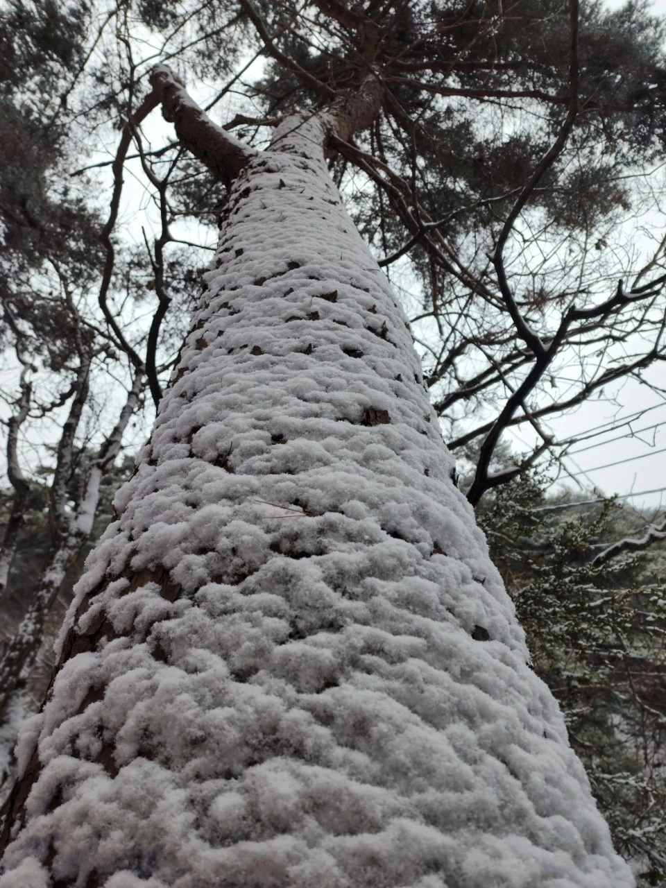 "그래, 이 분위기~" 내가 원하던 그림이 그려지는 순간이었다. 평소 같으면 이런 겨울 산행에 따뜻한 '사케' 나 '글루와인'을 챙겨 와서 기분을 더 업(up) 시켰을 텐데 오늘은 없다, 어떤 주류도 없다. 대신 달달한 봉지커피와 느낌 있는 국화차를 한잔씩 마셨다. 점심식사를 마치고 쏟아지는 눈을 맞으며 정상을 올랐다. 산아래로 내려다 보이는 과천시내가 온통 하얀 이불로 덮이고 관악산 전체가 온통 하얀 나라로 변해갔다.