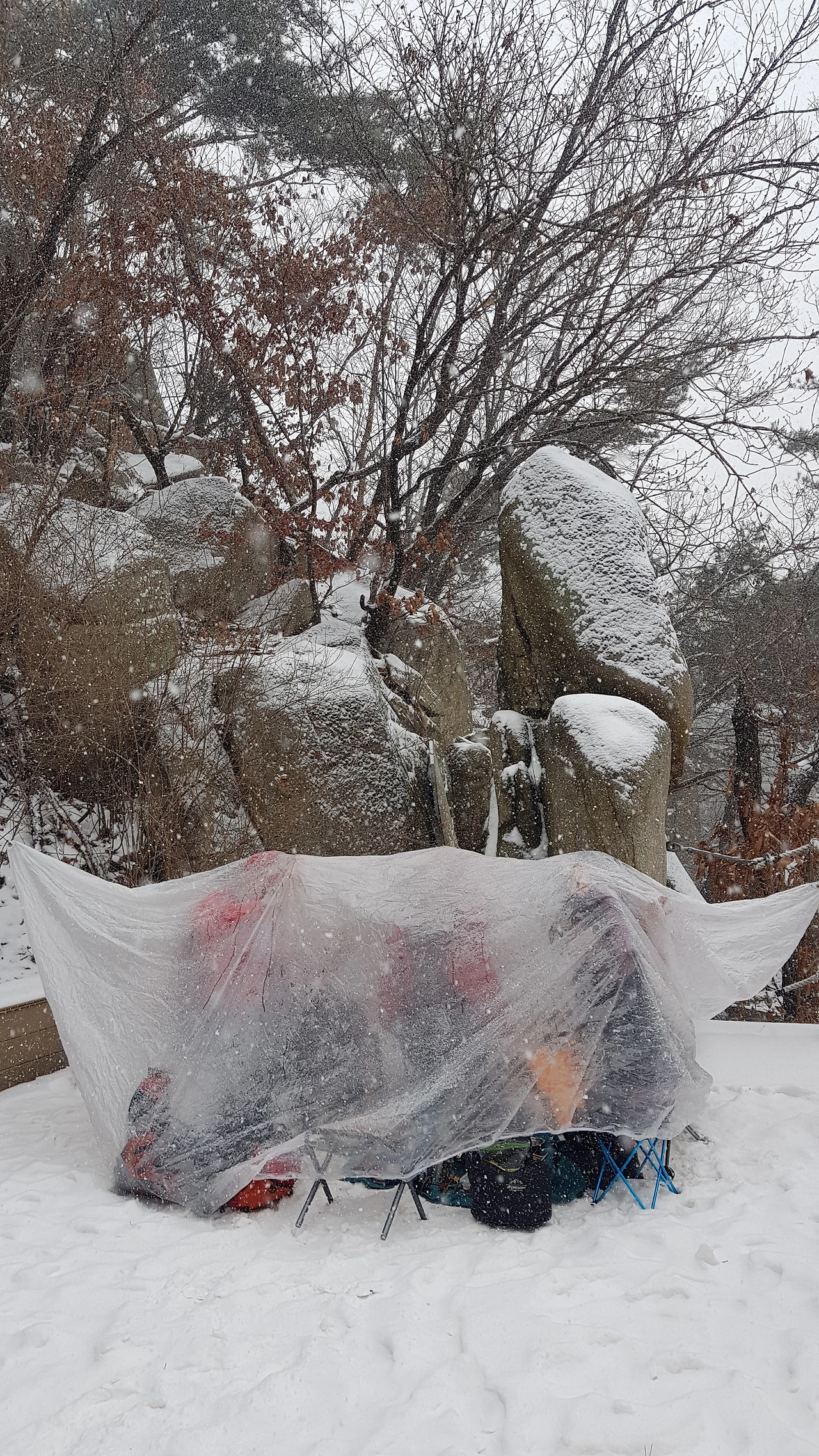준비해 간 음식들을 배낭에서 꺼내 중앙의 매트에 펼쳐놓았다. 등반대장이 준비한 어묵탕에서 김이 모락모락 피어올랐다. 훈훈한 열기와 함께 가수 김필의 <난, 너를> 이 외부와 분리된 공간에 울려 퍼진다. 갑자기 '뚜둑 뚜둑' 소리와 함께 하늘에서 함박눈이 천장 비닐을 두드린다. 밖을 보니 엄청난 눈이 앞을 분간하기 힘들 정도로 대지위에 내리친다.
