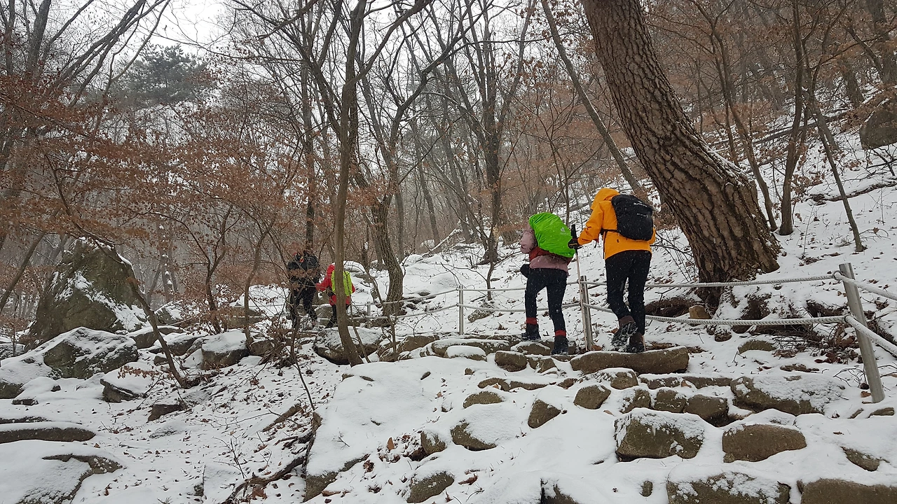 모임 장소에 가는 동안 살짝 나의 정신상태를 점검해 보았다. 내가 미쳤나? 날씨가 이렇게 추운데 등산이라니, 하면서도 살짝 위안이 되는 건 나 말고도 비슷한 상태의 사람들이 몇 명 더 있다는 것이다. 종합 과천청사역에서 등산을 같이할 동호회 회원들이다. 추운 겨울산행을 대비하여 털모자에 장갑, 마스크, 스패치(눈길을 헤쳐나가기 위해 발에 차는 천) 등으로 중무장을 하고 모두 모였다.