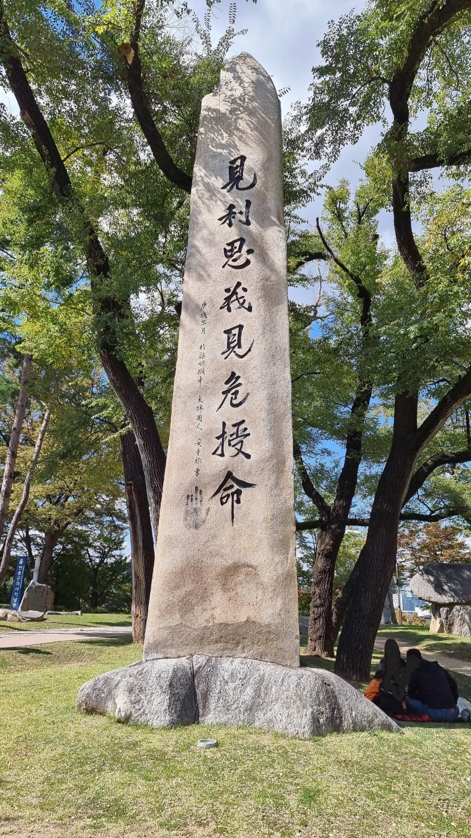 영화를 보고 나오는 길에 갑자기 남산에 위치한 안중근 의사 기념관을 가보고 싶다는 생각이 들었다. 그곳은 내가 어린 시절 뛰어놀던 곳으로 그의 동상과 더불어 커다란 비석이 항상 눈에 띄던 곳이다. 물론 어린 시절에는 비석을 무심코 지나쳤지만 이제 보니 그 의미가 크다. '見利思義 見危授命 (견리사의 견위수명)'이라는 글자와 손바닥 도장이 찍혀있다.