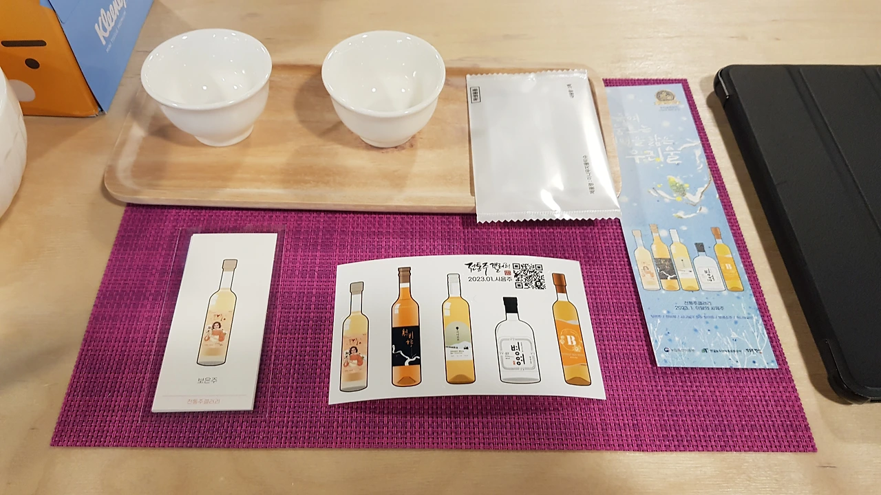 천비향(약주), 시나브로 청수 화이트(과실주), 보은주(탁주), 병영소주(증류식 소주), 허니바 와인(기타 주류)을 모두 마셨다. 강사는 제일 마음에 드는 것은 무엇이냐는 질문에 참석자들은 돌아가면서 본인의 소감과 인상 깊은 술을 이야기했다. 나는 40도짜리 '병영소주'와 꿀로 만든 '허니비와인'을 꼽았다.