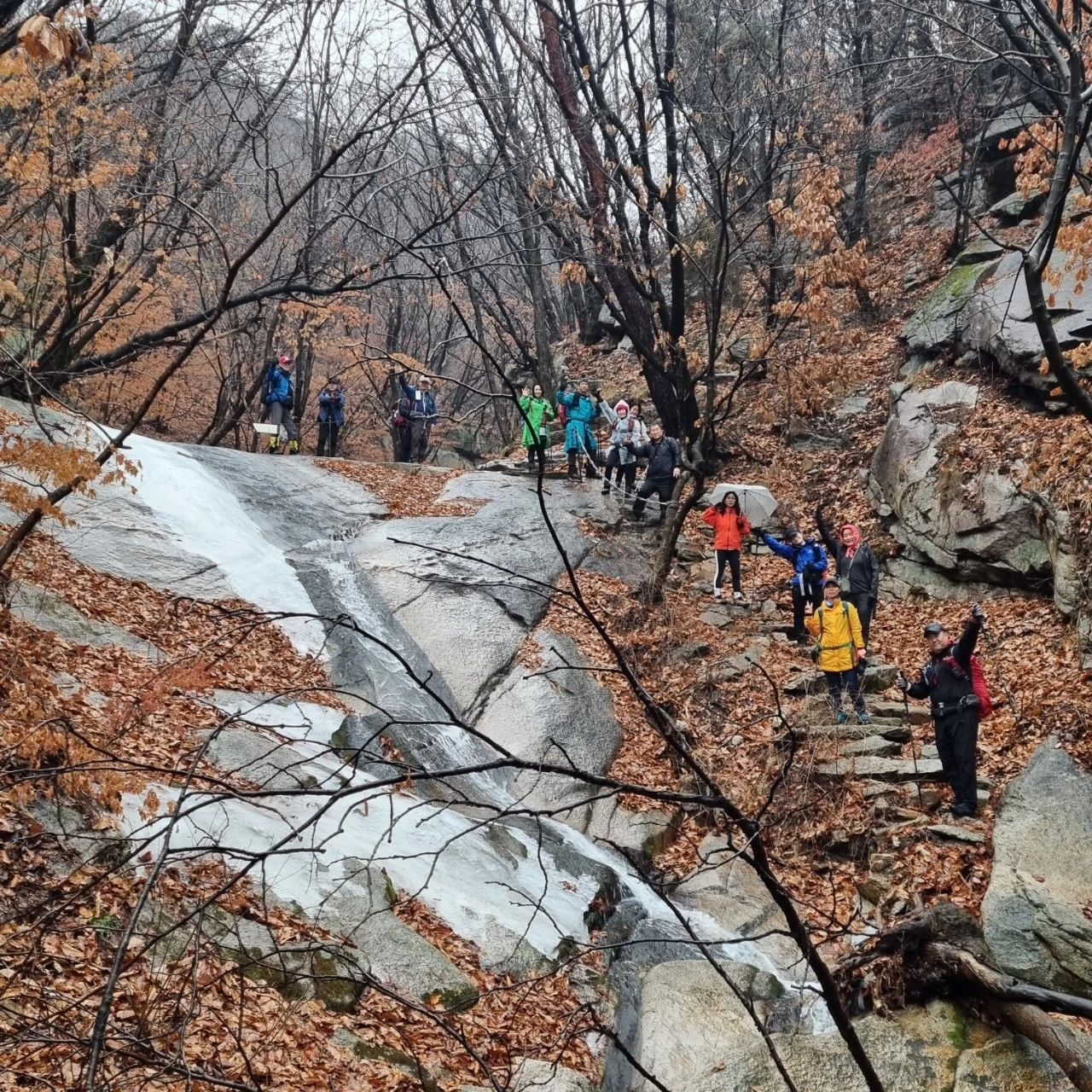 열여섯 명 모두 안전하게 원점회귀로 날머리를 통과했다. 물론 하산 중에 잠시 길을 헤매기도 했다. 겨울산은 특히 낙엽과 눈으로 뒤덮여 있어 등산로를 벗어나는 경우가 종종 발생한다. 하산길을 쭉쭉 내려가다 보면 '아차! ' 하고 길을 잘못 들었음을 깨닫는 순간에도 꾸억꾸억 비탐길(탐방길이 아닌 길)을 강행한다. 왜냐하면 다시 역으로 올라가기 싫기 때문이다. 하지만 산행초보자들에게 비탐길은 위험하기도 하고 두렵기도 하기 때문에 잘못된 길이라고 생각되면 바로 정상적인 탐방길을 찾아야 한다.