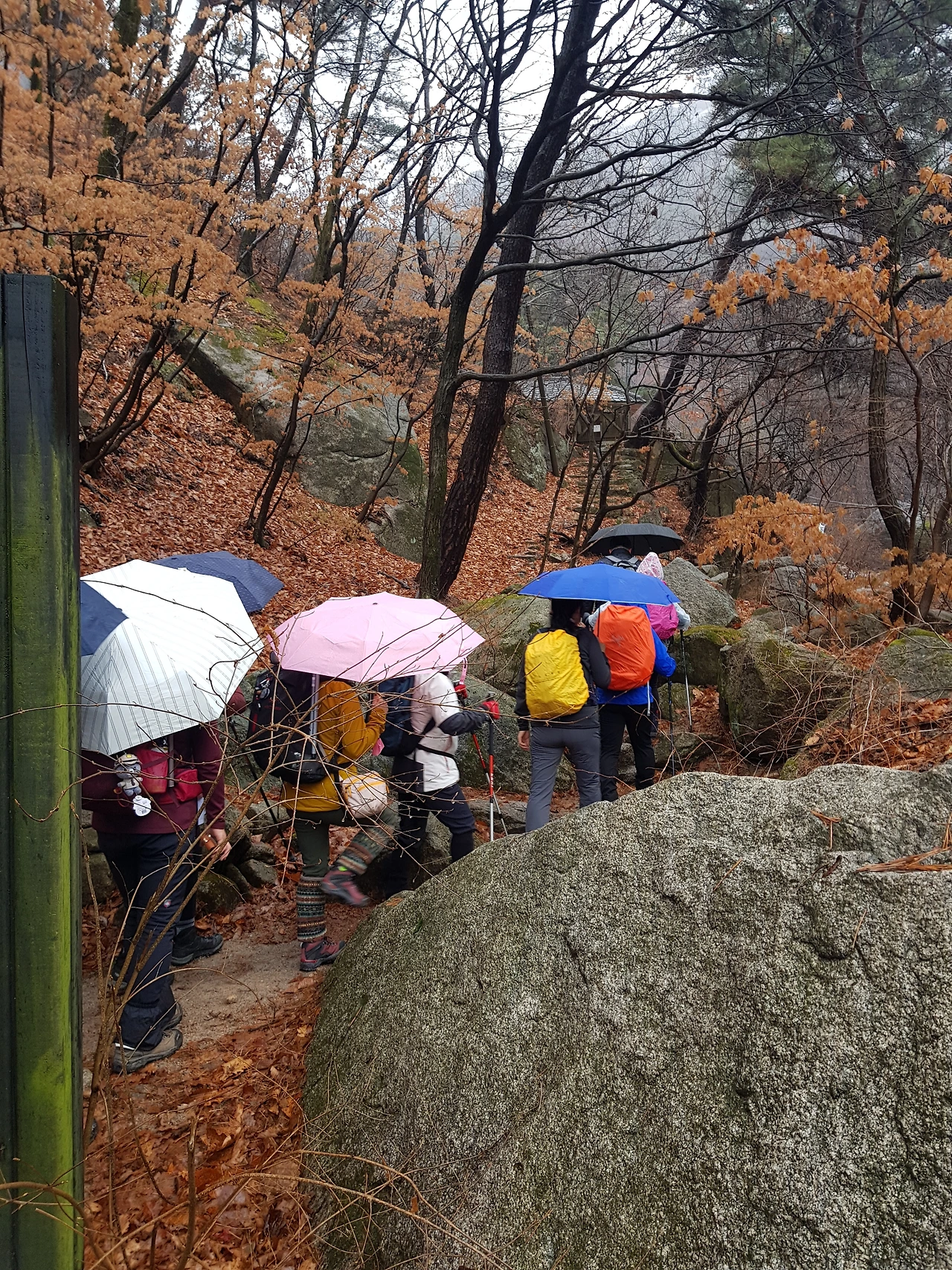 그런 사람들에게 비가 내리는데 등산을 하러 간다고 하면 당연히 미친 거 아니냐고 한다. 사실 함께 살고 있는 가족들도 이해를 못 했다. 그러던 것이 한 번 두 번 비가 오나, 눈이 오나, 날씨가 더우나, 날씨가 추우나 등산을 다니는 것을 옆에서 지켜보면 '저 인간, 원래 저런 거구나' 하고 내버려 둔다. 물론 비나 눈이 내리면 안전한 산행을 위해서 등산코스의 변경이 필요하긴 하지만 여간해서는 산행 자체를 취소하지는 않는다.