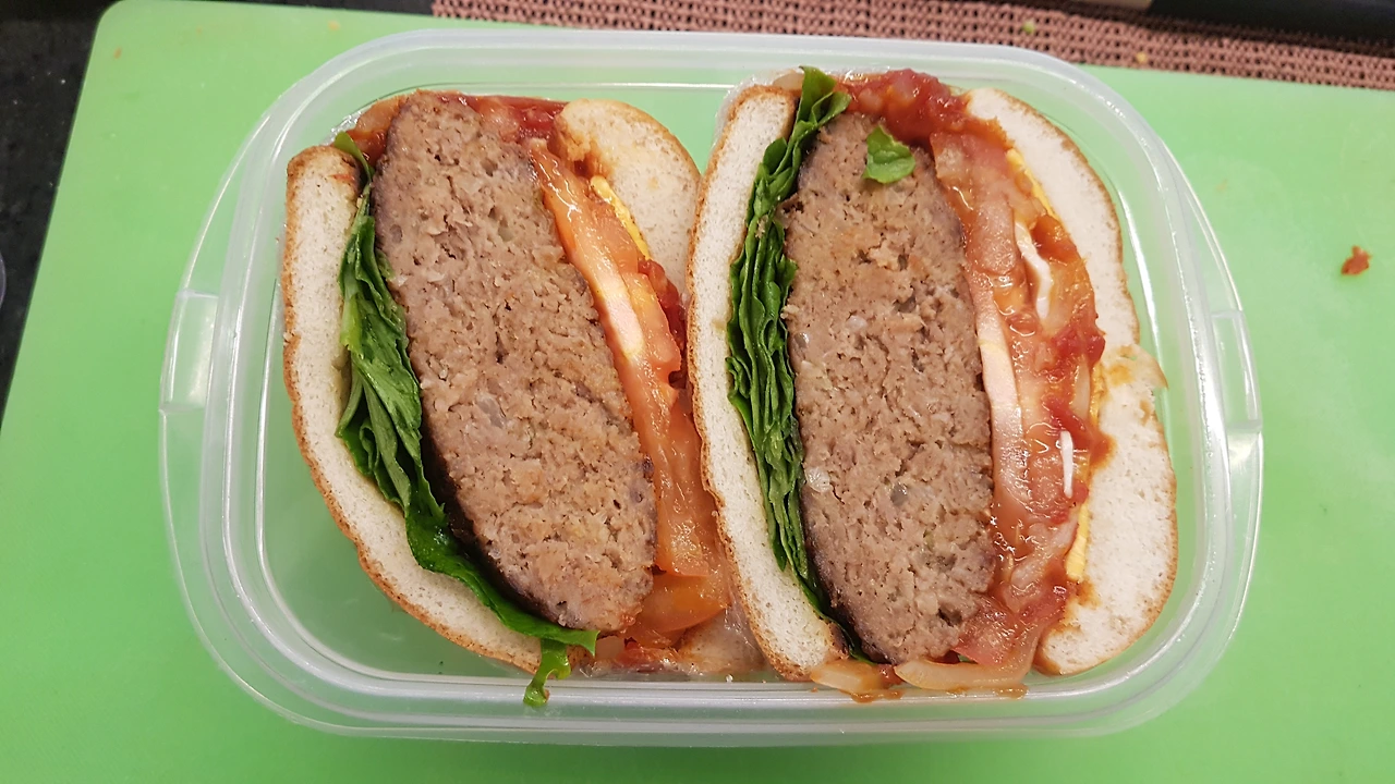 아무리 랩핑을 해도 고기패티 두께가 1cm가 넘는다. 속이 안 익을 까봐 걱정했는데, 잘라놓은 패티를 보니 그래도 잘 익어 보여 다행이었다. 가져온 햄버거를 한입 베어 먹었다. 아쉽지만 고기 패티는 살짝 빼내고 베어 먹었다. 주관적 평가이긴 하지만, 동네 햄버거 보다 더 맛있다. 특히, 양파의 양념의 잘 베인 바비큐 소스가 햄버거의 풍미를 더욱 높여주는 느낌이다. 오늘은 왠지 채식주의를 실천하는 내가 조금 아쉽기는 했다.