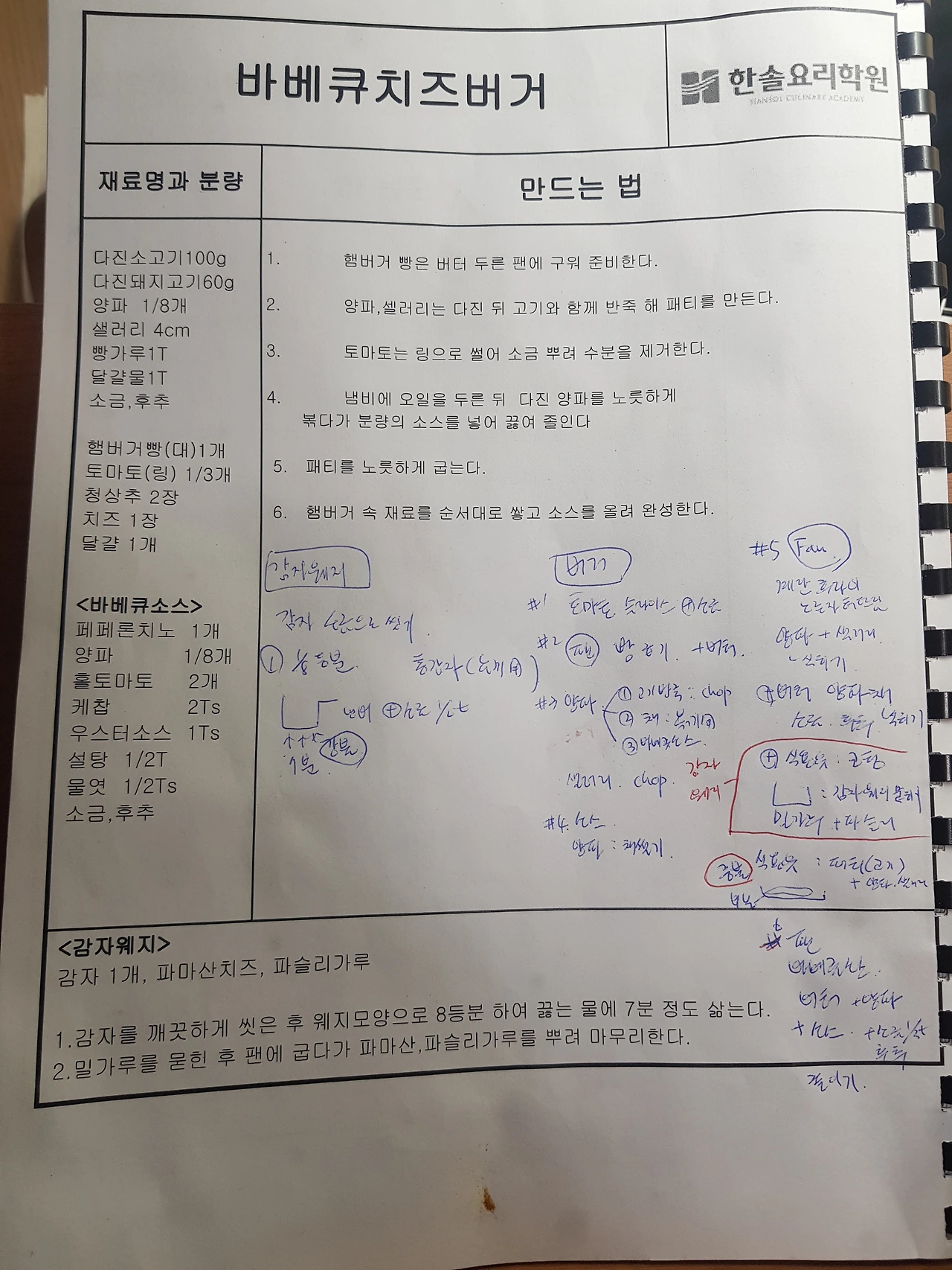 사 먹을 때는 간단한 햄버거이지만 만들어 먹을 때는 얘기가 달라진다. 요리학원에서 진행되는 오늘의 메뉴는 '바비큐 치즈버거'이다. 이름에서 풍기는 느낌은 왠지, 바비큐 고기를 넣을 거 같지만 정확하게 표현하자면 '바비큐 소스가 들어간 치즈버거'가 맞다. 수업시작하기 전에 실습 재료들을 받아서 손질을 시작한다.