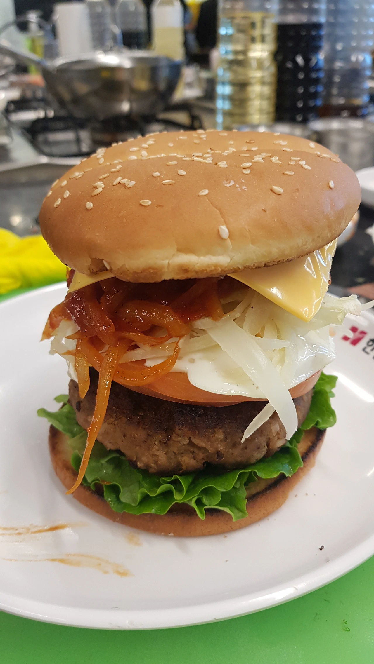 패티 내부에 공기가 빠지게 몇 차례 치대고 햄거버 빵보다 살짝 크게 원형으로 모양을 만들어 팬에 노릇하게 굽는다. 패티가 두꺼우면 잘 익지 않아 수강생 몇 명은 고기패티를 까맣게 태웠다. 재빨리 불을 줄이고 뚜껑을 덮어 촉촉하고 은은하게 잘 익혀낸다. 모든 준비가 끝나면 햄버거 빵 위에 9층 탑을 쌓는다. 상추, 고기패티, 토마토, 계란프라이, 양파채, 바비큐소스, 치즈 그리고 다시 빵으로 덮는다.