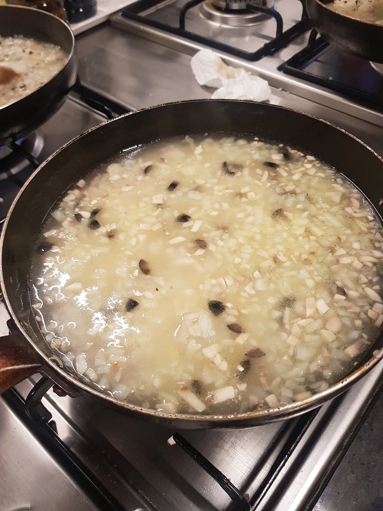 어느 정도 볶아지면 치킨베이스(물 3컵, 치킨스톡가루 작은 1스푼)를 부어 강불로 끓여주면서 거품찌꺼기를 거둬준다. 쌀이 손톱으로 눌러 으깨질 정도가 되면 여기에 생크림, 우유, 파마산치즈가루, 소금, 후추 그리고 모차렐라 치즈를 추가하고 밥이 되직해질 때까지 졸인다. 수분기가 거의 없게 되면 식혀서 밥을 둥글게 또는 타원형 모양의 주먹밥 형태로 뭉친다.