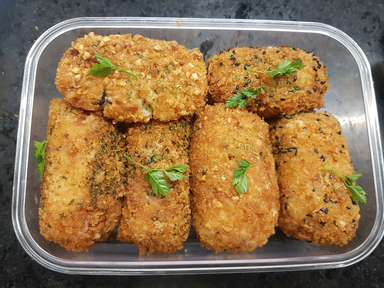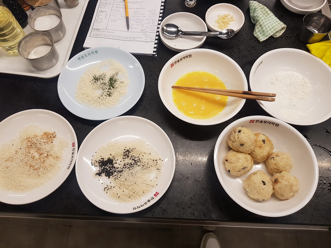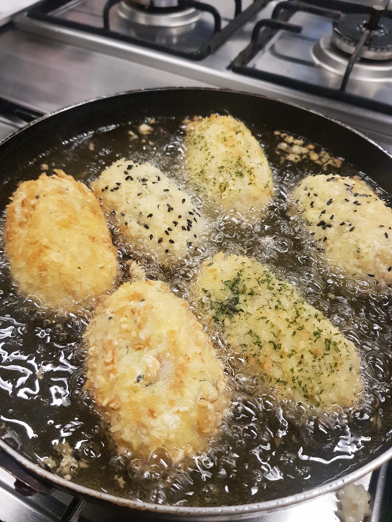주먹밥을 튀겨내기 위해 '밀계빵' 순으로 튀김옷을 준비한다. '밀께빵'은 밀가루, 계란, 빵가루를 말한다. 다양한 색감과 맛을 위해 빵가루를 3개의 접시에 나누고 파슬리, 검정깨, 땅콩가루를 각각 섞어준다. 튀김을 단단하게 만들기 위해 밀가루에 전분가루를 섞어서 주먹밥 위에 묻히고 젓가락으로 잘 저은 계란물을 흥건히 적신다.