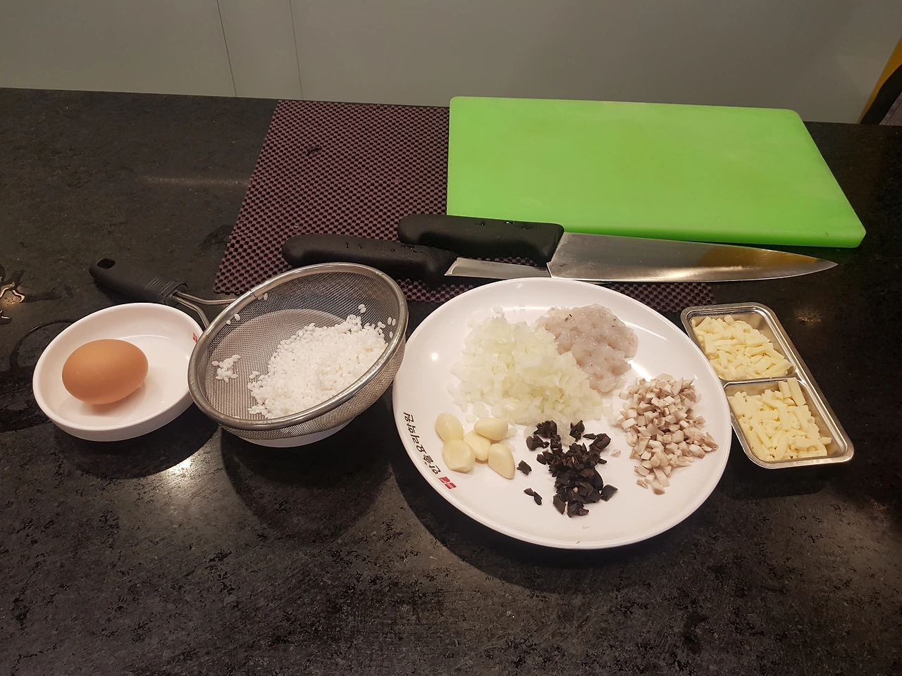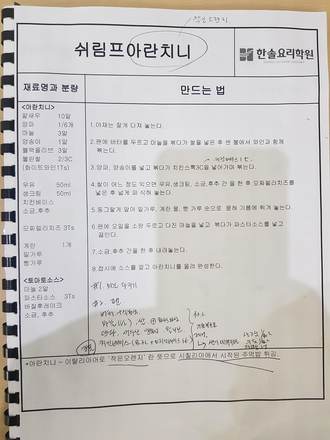 아란치니(arancine)는 이탈리아어로 '작은 오렌지'란 뜻으로 이태리 시칠리아에서 시작된 주먹밥 튀김 요리이다. 우선 주먹밥을 만들기 위해 쌀과 함께 들어갈 마늘, 양파, 새우살, 양송이, 검은 올리브를 깨끗이 씻고 잘게 다져서 접시에 담아놓는다. 팬을 달구어 버터와 식용유를 넣고 다져놓은 재료들을 넣고 볶으면서 추가로 새우살의 냄새를 중화하기 위해 화이트와인을 살짝 뿌린다.