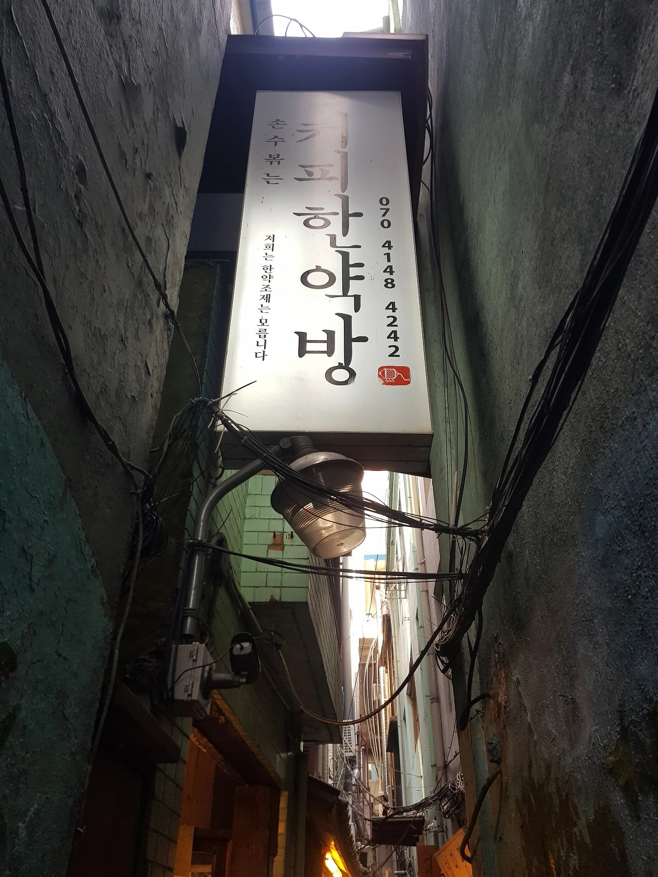 점심식사를 마치고 조금 걷다보니 을지로 골목 건물사이로 한 사람이 겨우 통과할 만한 비좁은 사잇길 중간즈음에 머리 위로 독특한 글씨체로 '커피한약방'이라는 간판이 보인다. 1층에서 커피를 주문하고 건너편 건물의 좁다란 계단을 오르면 이층에 커피를 마실 수 있는 별도의 공간이 있다. 한약방에서나 볼 수 있을 거 같은 한약재를 보관하는 커다란 나무 서랍으로 짜인 오래돼 보이는 장식장과 자개장으로 인테리어 되어 있다.