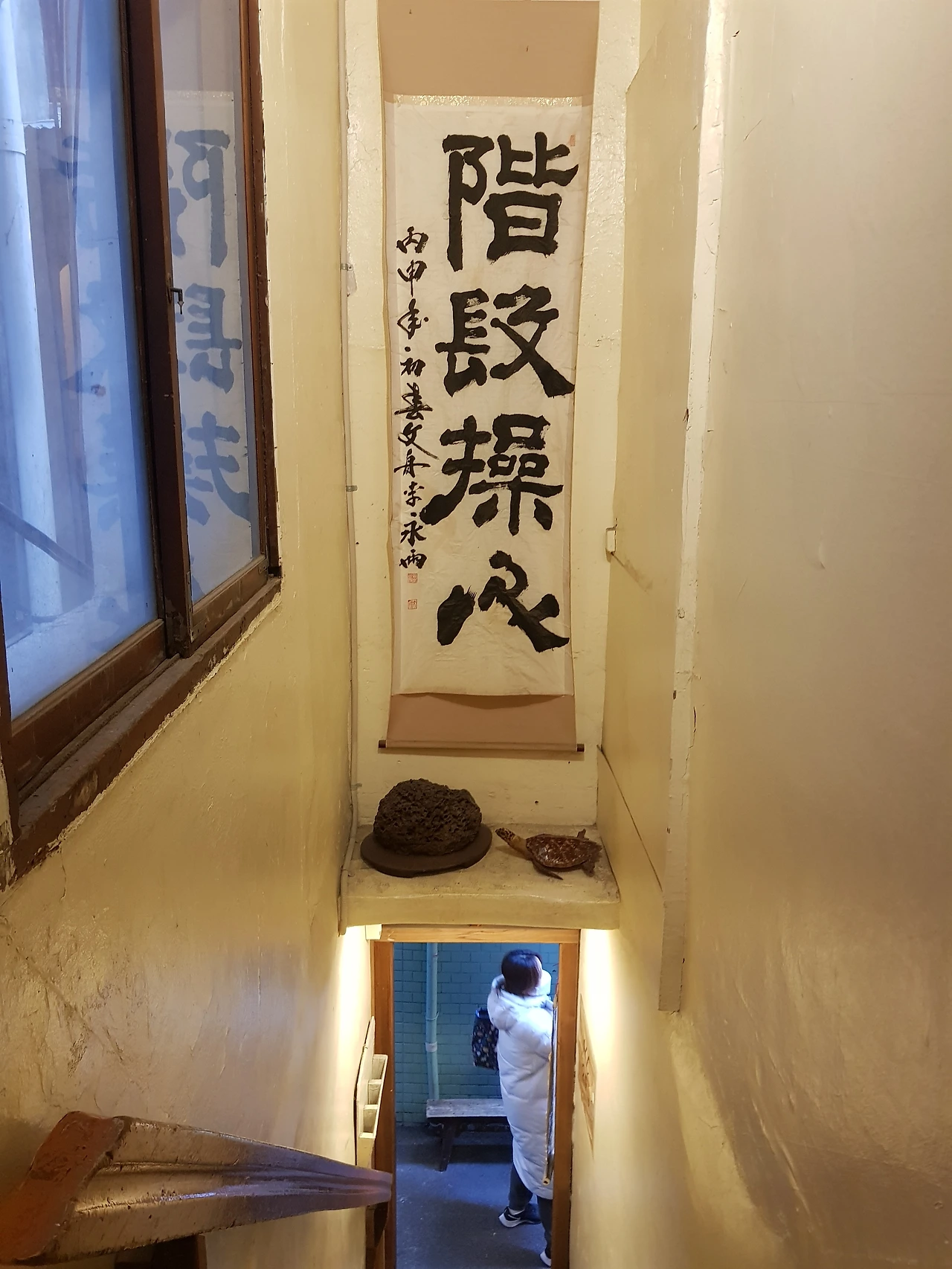 오래전에는 진짜 한약을 팔던 곳임을 느낄 수 있다. 커피를 마시고 다시 1층으로 내려가는 가파른 계단의 머리 위 벽면에 멋지게 쓰여진 사자성어(계단조심)가 붙어있고 그 밑에 장수를 상징하는 '거북이 박제'가 한 마리 놓여있다. 지나간 과거가 박제되어 우리에게 다가오는 레트로(Retrospect, 추억)의 향수가 느껴진다. 이곳이 바로 뉴트로(New+Retro), 힙트로(Hip+Retro)의 성지인 '힙지로' (Hip+Eulgiro)이다.