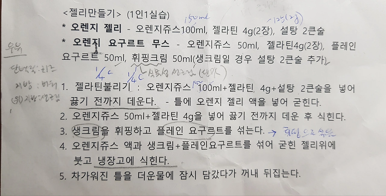 오늘의 젤리는 오렌지를 베이스로 만들어진 이층짜리 젤리이다. 위층에는 오렌지주스, 젤라틴, 설탕으로 만들어지고 아래층은 오렌지주스, 젤라틴, 플레인 요구르트, 휘핑크림(식물성 생크림)으로 만들어진다. 액체인 오렌지 주스가 젤라틴을 만나서 하나의 덩어리가 되었다. 과연 뭉쳐서 잘 살 수 있을지는 모르겠지만 새콤달콤한 맛이 봄 햇살과 함께 오늘을 행복하게 해 준다.