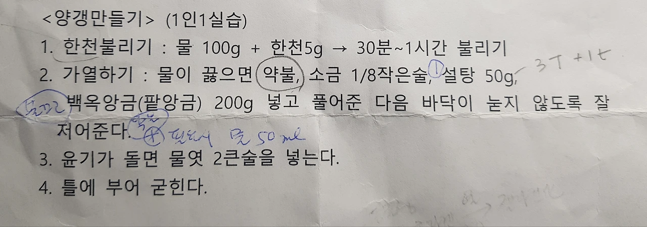 다만 한천을 가량 물에 불리고 약불에서 서서히 녹이는 것이 요령이다. 요리 선생님은 딱딱하게 굳은 시범 양갱을 몇 개 별모양 틀에 플레이팅하고 나머지를 먹기 좋게 수강생 수만큼 잘랐다. 갑자기 수강생들의 눈이 초롱초롱 빛나면서 입안에 침이 고이기 시작했다. 역시나 부드럽고 달콤한 팥의 풍미가 입안을 감싸고돈다. 점심식사 후의 후식으로는 안성맞춤이다.